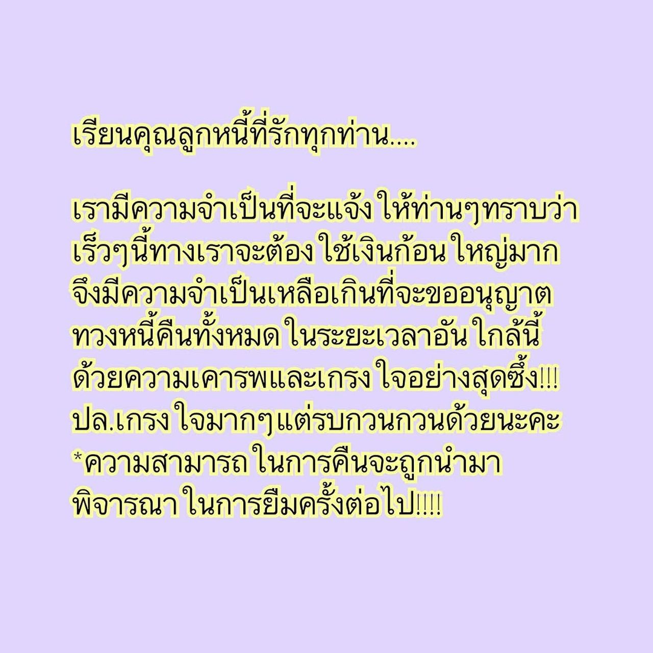 “เรียนลูกหนี้ที่รักทุกท่าน… เรามีความจำเป็นที่จะแจ้งให้ท่านๆ ทราบว่า เร็วๆ นี้ทางเราจะต้องใช้เงินก้อนใหญ่มาก จึงมีความจำเป็นเหลือเกินที่จะขออนุญาตทวงหนี้คืนทั้งหมดในระยะเวลาอันใกล้นี้ ด้วยความเคารพและเกรงใจอย่างสุดซึ้ง!!! ปล.เกรงใจมากๆ แต่รบกวนด้วยนะคะ *ความสามารถในการคืนจะถูกนำมาพิจารณาในการยืมครั้งต่อไป!!!!”
