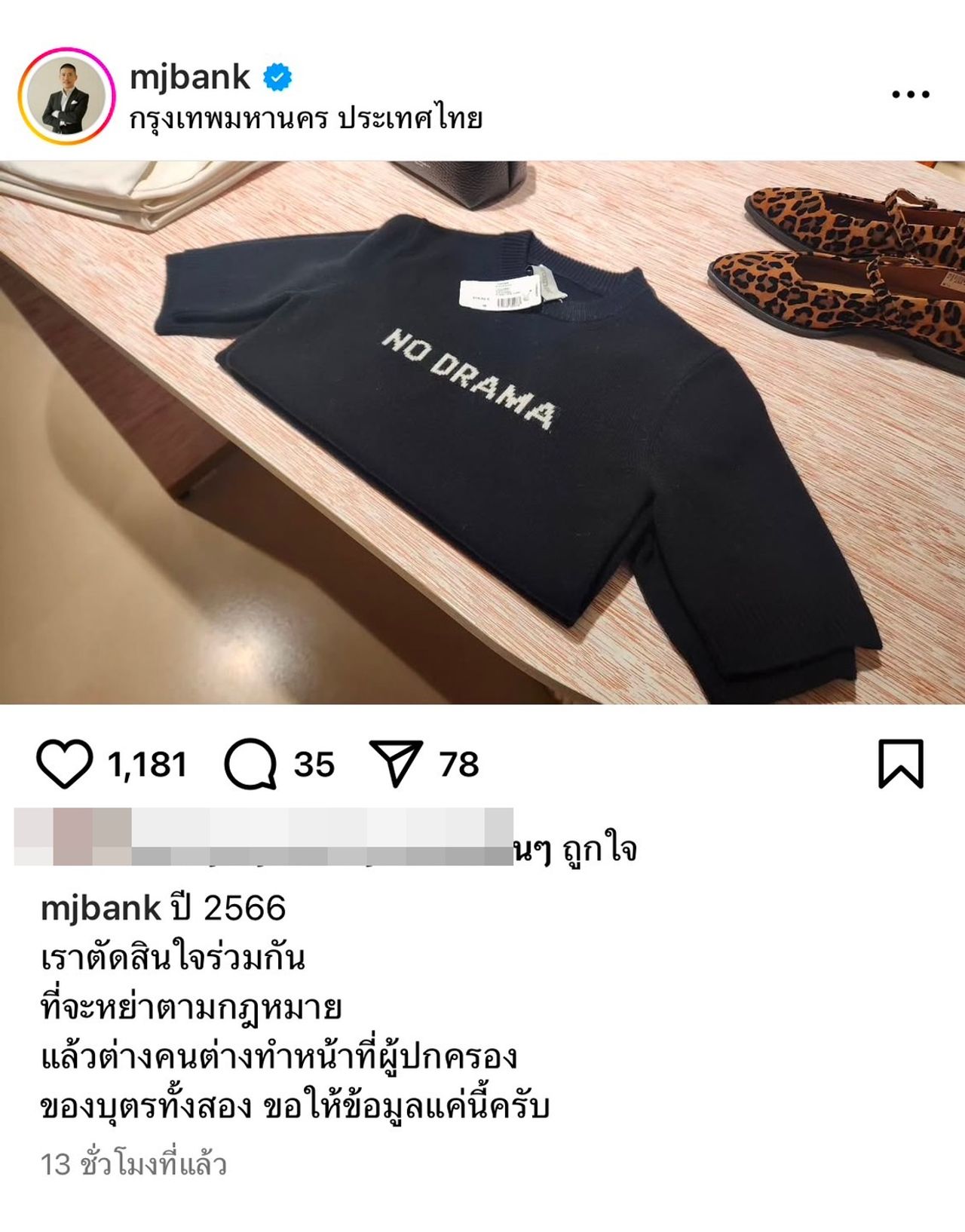 และล่าสุด แบงค์ พชร ได้ออกมาโพสต์เคลียร์ชัดถึงสถานะความสัมพันธ์กับภรรยาสาว โดยโพสต์ภาพเสื้อที่มีข้อความ NO DRAMA พร้อมแคปชั่นว่า “ปี 2566 เราตัดสินใจร่วมกัน ที่จะหย่าตามกฎหมาย แล้วต่างคนต่างทำหน้าที่ผู้ปกครอง ของบุตรทั้งสอง ขอให้ข้อมูลแค่นี้ครับ”