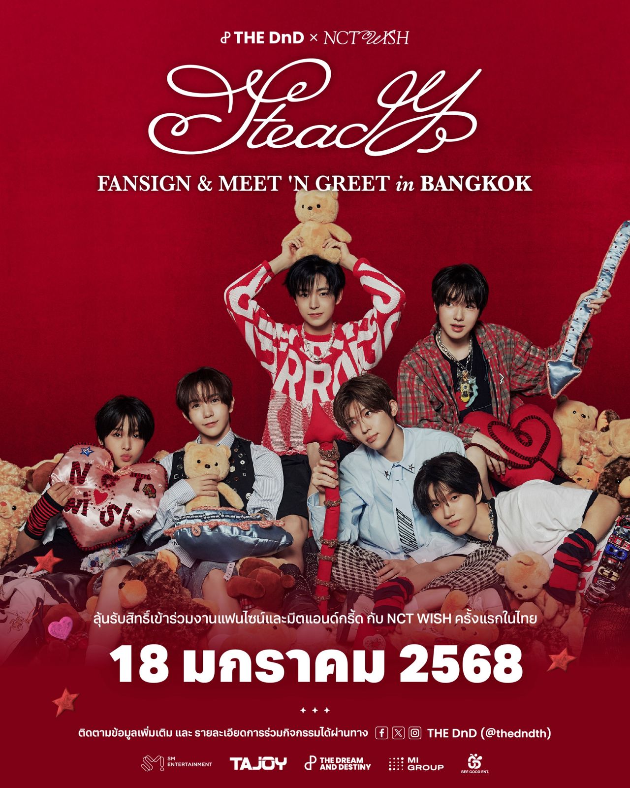 เหล่า NCTzen ชาวไทยเตรียมนับถอยหลัง! ต้อนรับ ‘NCT WISH’ บอยกรุ๊ปน้องใหม่มาแรงแห่งค่าย SM Entertainment ที่ถูกขนานนามว่าเป็น ‘ไอคอนแห่ง Gen Z’ ที่มาพร้อมความน่ารักสดใส ภายใต้คอนเซ็ปต์ “WISH for Our WISH” ในงาน ‘THE DnD x NCT WISH ‘STEADY’ FANSIGN & MEET ‘N GREET in BANGKOK’ กับกิจกรรมแฟนไซน์และมีตแอนด์กรี๊ดสุดพิเศษของ NCT WISH ครั้งแรกในไทย จัดโดย บริษัท The Dream and Destiny (The DnD) และพาร์ทเนอร์อย่าง MI GROUP และ BEE GOOD ENTERTAINMENT ในวันเสาร์ที่ 18 มกราคม 2568 เวลา 12.30 น. เป็นต้นไป ณ Siam Paragon ชั้น 1 ลาน Fashion Hall ซึ่งงานนี้ NCT WISH เตรียมตัวมาสร้างความประทับใจกับกิจกรรมสุดพิเศษ พร้อมฝากคลิปมาอ้อนแฟน ๆ ก่อนเจอกันด้วย