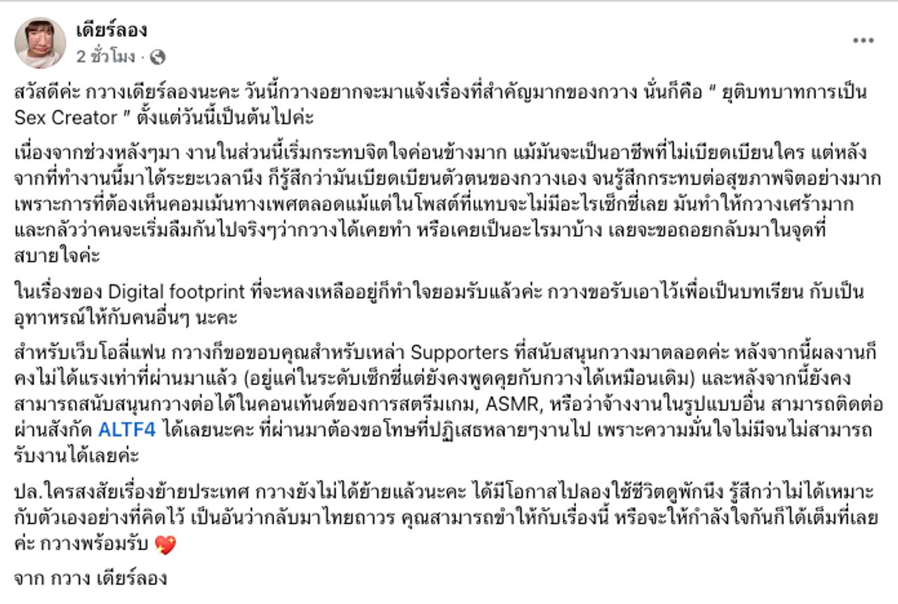 "สวัสดีค่ะ กวางเดียร์ลองนะคะ วันนี้กวางอยากจะมาแจ้งเรื่องที่สำคัญมากของกวาง นั่นก็คือ “ยุติบทบาทการเป็น Sex Creator” ตั้งแต่วันนี้เป็นต้นไปค่ะ