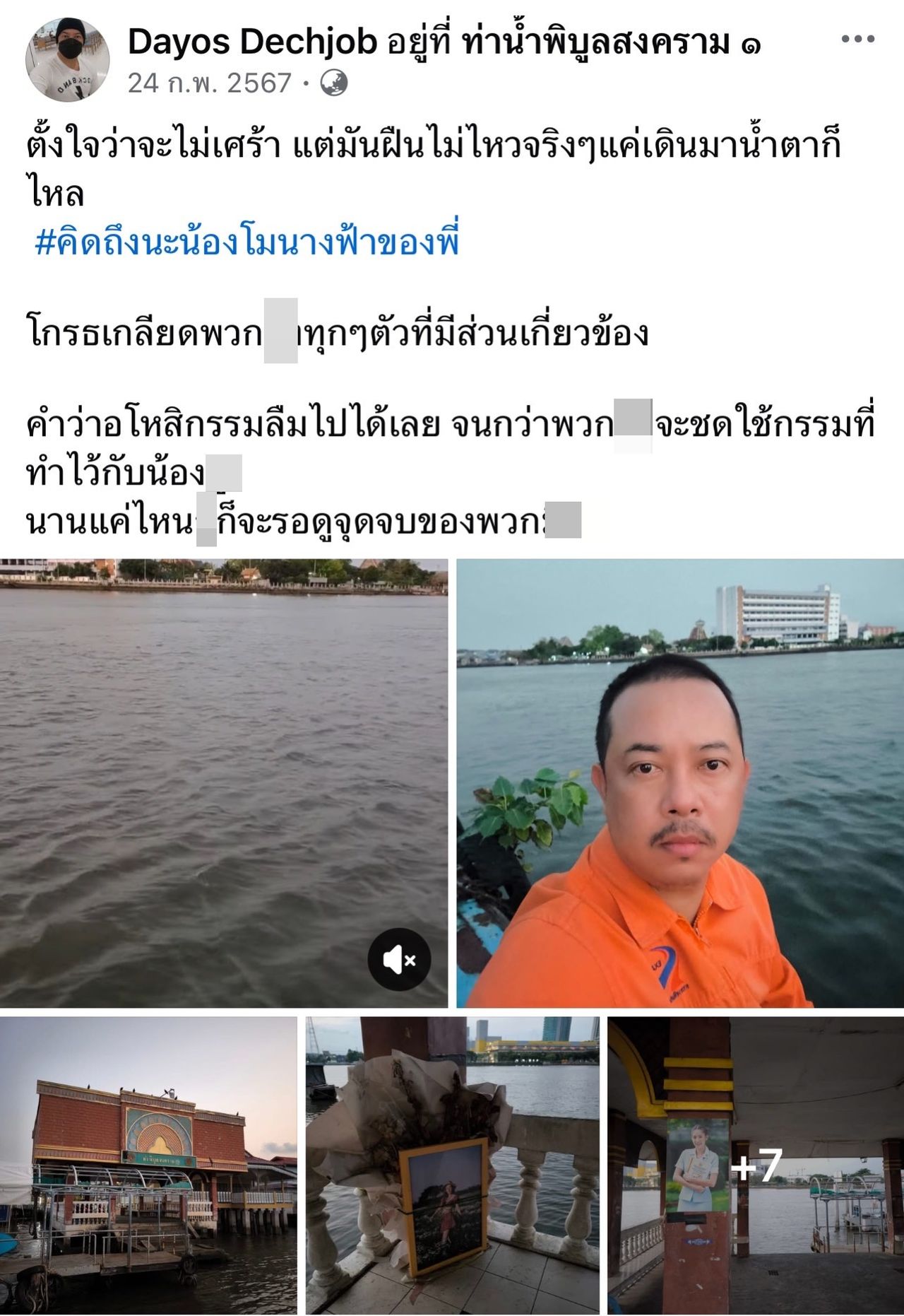 ซึ่งก่อนหน้านี้ต่อยก็ได้โพสต์ไปที่ท่าน้ำพิบูลสงครามมาก่อน พร้อมข้อความว่า "ตั้งใจว่าจะไม่เศร้า แต่มันฝืนไม่ไหวจริงๆ แค่เดินมาน้ำตาก็ไหล #คิดถึงนะน้องโมนางฟ้าของพี่ โกรธเกลียดพวกมึงทุกๆ ตัวที่มีส่วนเกี่ยวข้อง คำว่าอโหสิกรรมลืมไปได้เลย จนกว่าพวกมึงจะชดใช้กรรมที่ทำไว้กับน้องกู นานแค่ไหนกูก็จะรอดูจุดจบของพวกมึง"