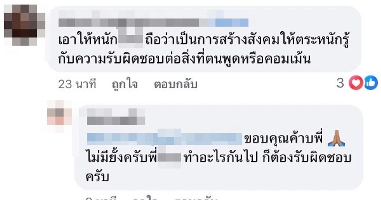 นอกจากนี้ยังมีคนเข้ามาคอมเมนต์ใต้โพสต์ที่หนุ่มคนดังกล่าวชี้แจงว่า "เอาให้หนัก...ถือว่าเป็นการสร้างสังคมให้ตระหนักรู้กับความรับผิดชอบต่อสิ่งที่ตนพูดหรือคอมเมนต์" ซึ่งเจ้าตัวก็ได้มาคอมเมนต์ตอบกลับว่า "ขอบคุณค้าบพี่ ไม่มียั้งครับพี่... ทำอะไรกันไป ก็ต้องรับผิดชอบครับ"
