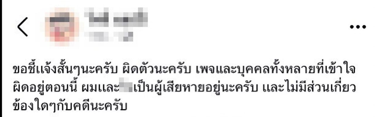 "ขอชี้แจ้งสั้นๆ นะครับ ผิดตัวนะครับ เพจและบุคคลทั้งหลายที่เข้าใจผิดอยู่ตอนนี้ ผมและ...เป็นผู้เสียหายอยู่นะครับ และไม่มีส่วนเกี่ยวข้องใดๆ กับคดีนะครับ" และยังโพสต์รูปไปแจ้งความและเขียนข้อความว่า "ลงบันทึกประจำวันเพื่อเป็นหลักฐาน โพสต์หมิ่นประมาททำให้เสื่อมเสียครับ"