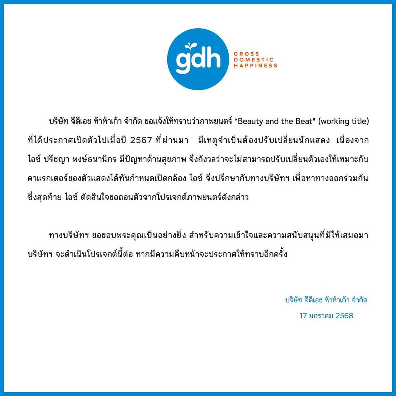 เมื่อวันที่ 17 ม.ค 68 ทาง GDH ได้โพสต์จดหมายระบุถึงสาเหตุที่ ไอซ์ ปรีชญา ขอถอนตัวเอาไว้ว่า “บริษัท จีดีเอช ห้าห้าเก้า จำกัด ขอแจ้งให้ทราบว่าภาพยนตร์ “Beauty and the Beat” (working title) ที่ได้ประกาศเปิดตัวไปเมื่อปี 2567 ที่ผ่านมา มีเหตุจำเป็นต้องปรับเปลี่ยนนักแสดง