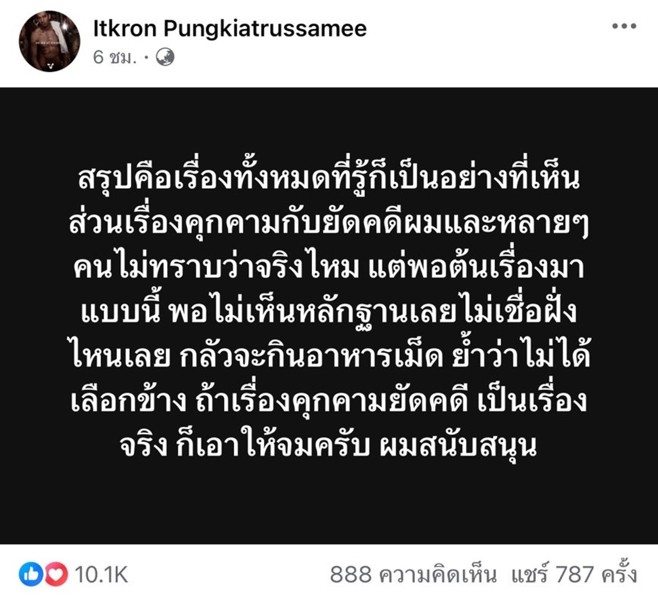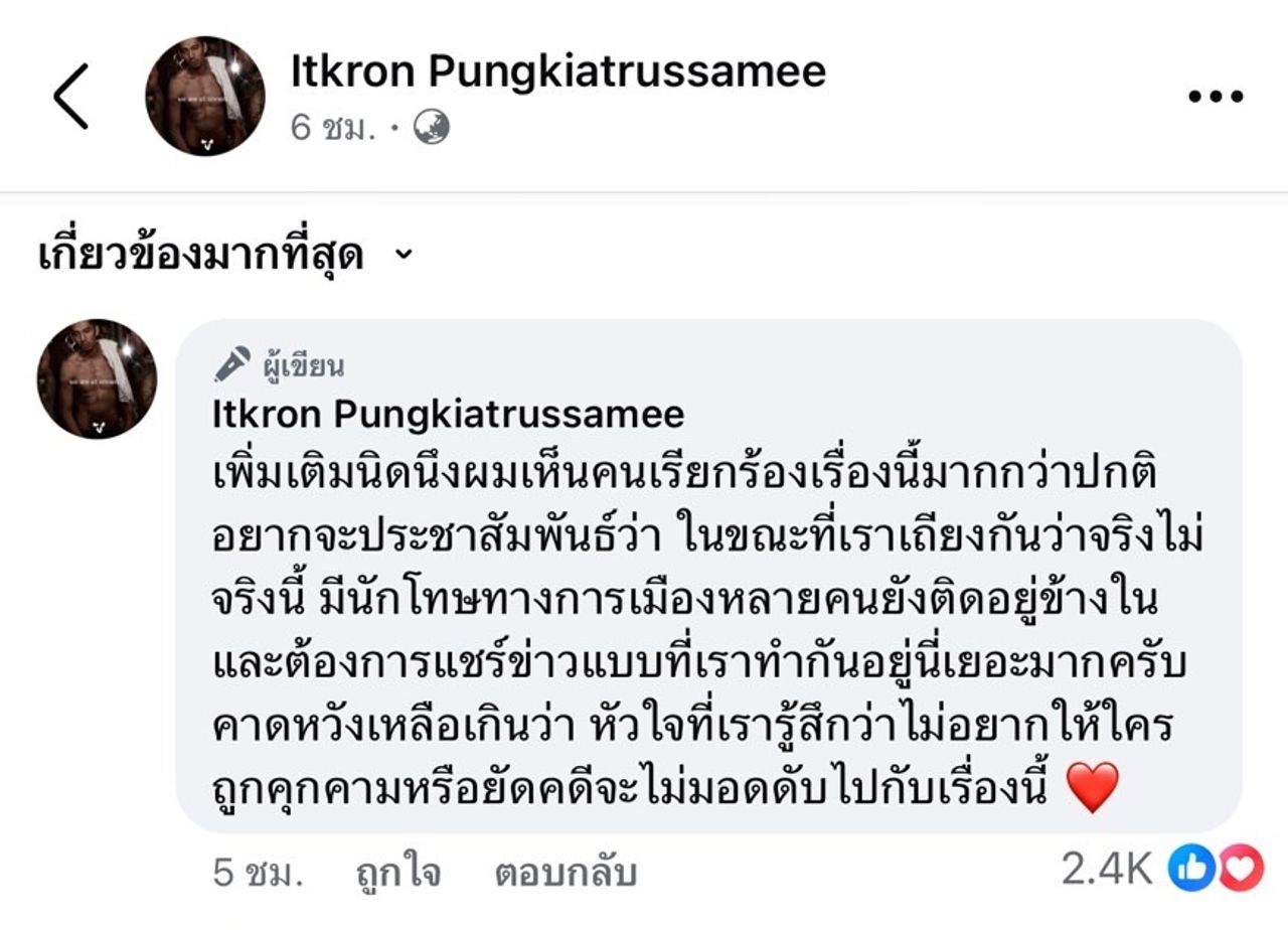จากนั้นก็โพสต์ข้อความเพิ่มเติมในคอมเมนต์ว่า “เพิ่มเติมนิดนึงผมเห็นคนเรียกร้องเรื่องนี้มากกว่าปกติ อยากจะประชาสัมพันธ์ว่า ในขณะที่เราเถียงกันว่าจริงไม่จริงนี้ มีนักโทษทางการเมืองหลายคนยังติดอยู่ข้างใน และต้องการแชร์ข่าวแบบที่เราทำกันอยู่นี่เยอะมากครับ คาดหวังเหลือเกินว่า หัวใจที่เรารู้สึกว่าไม่อยากให้ใครถูกคุกคามหรือยัดคดีจะไม่มอดดับไปกับเรื่องนี้”