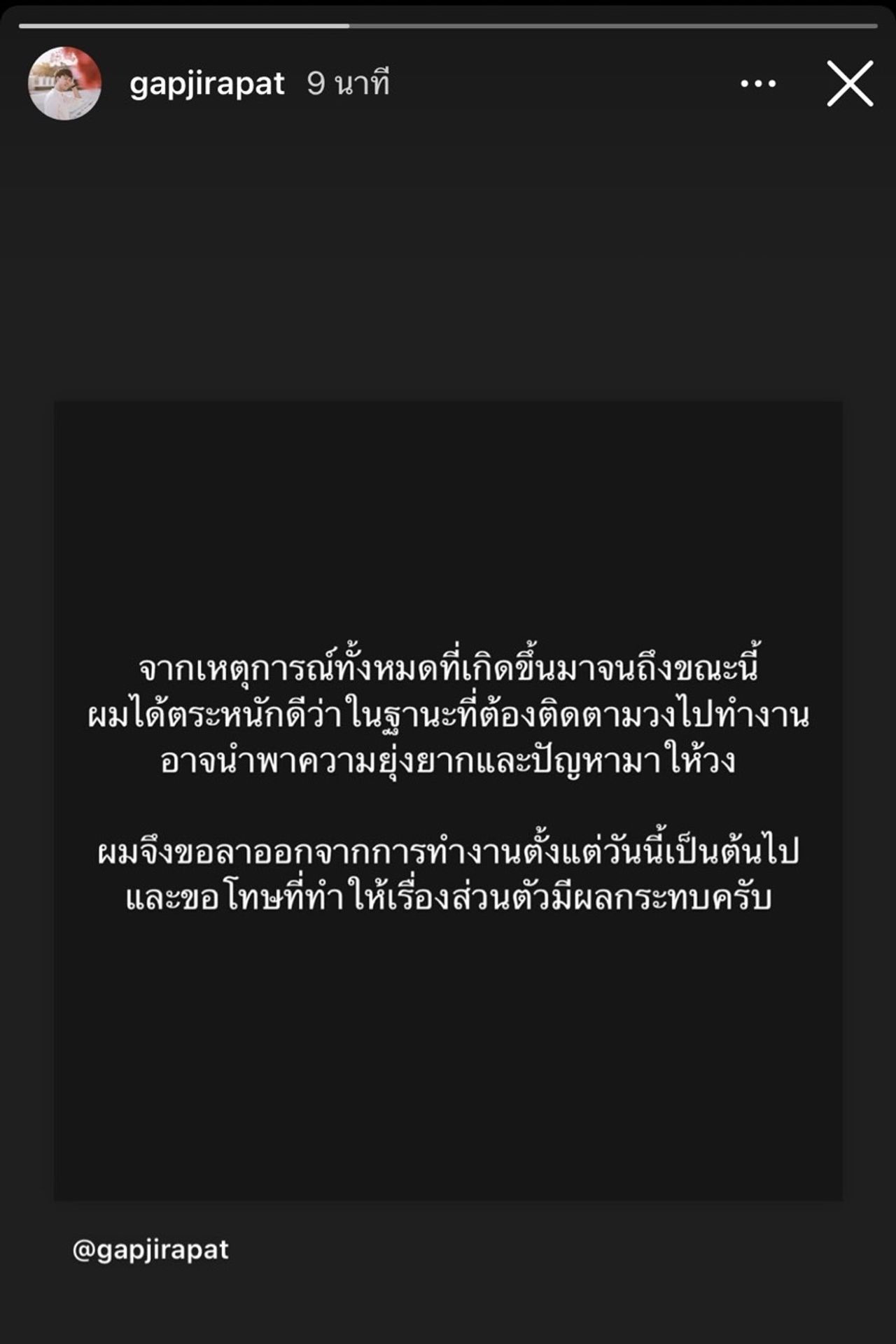 และล่าสุด แก๊ป โพสต์ไอจีว่าตัดสินใจขอลาออกจากการทำงานกับวง Tilly Birds แล้ว โดยบอกว่า “จากเหตุการณทั้งหมดที่เกิดขึ้นมาจนถึงขณะนี้ ผมได้ตระหนักดีว่าในฐานะที่ต้องติดตามวงไปทำงาน อาจนำพาความยุ่งยากและปัญหามาให้วง ผมจึงขอลาออกจากการทำงานตั้งแต่วันนี้เป็นต้นไป และขอโทษที่ทำให้เรื่องส่วนตัวมีผลกระทบครับ”