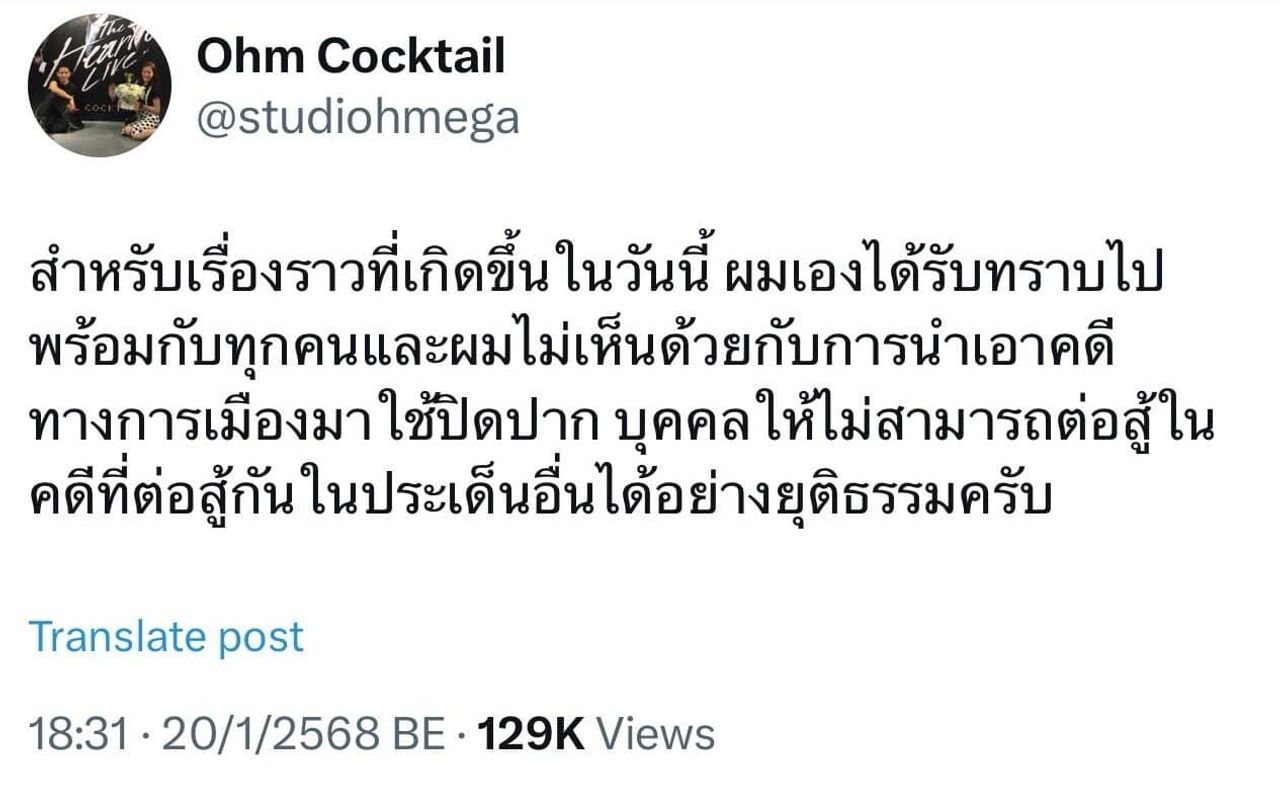 ล่าสุด โอม ปัณฑพล ประสารราชกิจ หรือ โอม ค็อกเทล นักร้องหนุ่ม ก็ได้แสดงความคิดเห็นถึงเรื่องนี้ว่า “สำหรับเรื่องราวที่เกิดขึ้นในวันนี้ ผมเองได้รับทราบไปพร้อมกับทุกคน และผมไม่เห็นด้วยกับการนำเอาคดีทางการเมืองมาใช้ปิดปากบุคคล ให้ไม่สามารถต่อสู้ในคดีที่ต่อสู้กันในประเด็นอื่นได้อย่างยุติธรรมครับ"