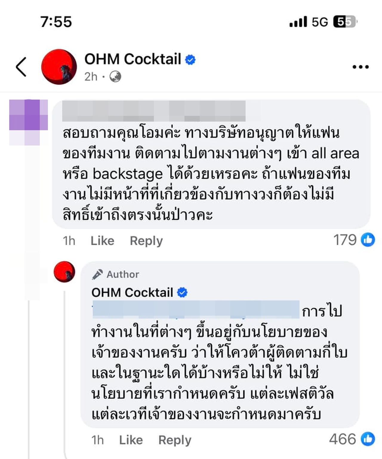 “สอบถามคุณโอมค่ะ ทางบริษัทอนุญาตให้แฟนของทีมงาน ติดตามไปตามงานต่างๆ เข้า all area หรือ backstage ได้ด้วยเหรอคะ ถ้าแฟนของทีมงานไม่มีหน้าที่ที่เกี่ยวข้องกับทางวงก็ต้องไม่มีสิทธิ์เข้าถึงตรงนั้นป่าวคะ”