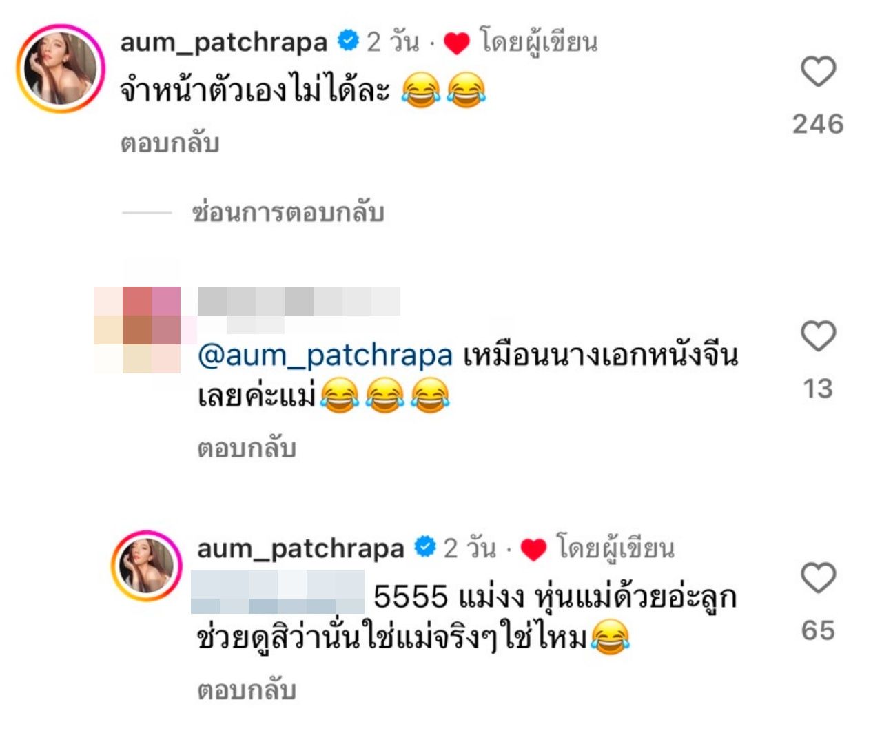 แต่งานนี้ที่เห็นจะดูช็อตฟีลสุดๆ เมื่ออั้มได้เข้ามาคอมเมนต์ในรูปของพี่เอว่า "จำหน้าตัวเองไม่ได้ละ" ด้านแฟนๆ ก็ได้เข้ามาคอมเมนต์ว่า "เหมือนนางเอกหนังจีนเลยค่ะแม่" และอั้มก็ได้ตอบกลับไปว่า "5555 แม่งง หุ่นแม่ด้วยอ่ะลูก ช่วยดูสิว่านั่นใช่แม่จริงๆ ใช่ไหม"