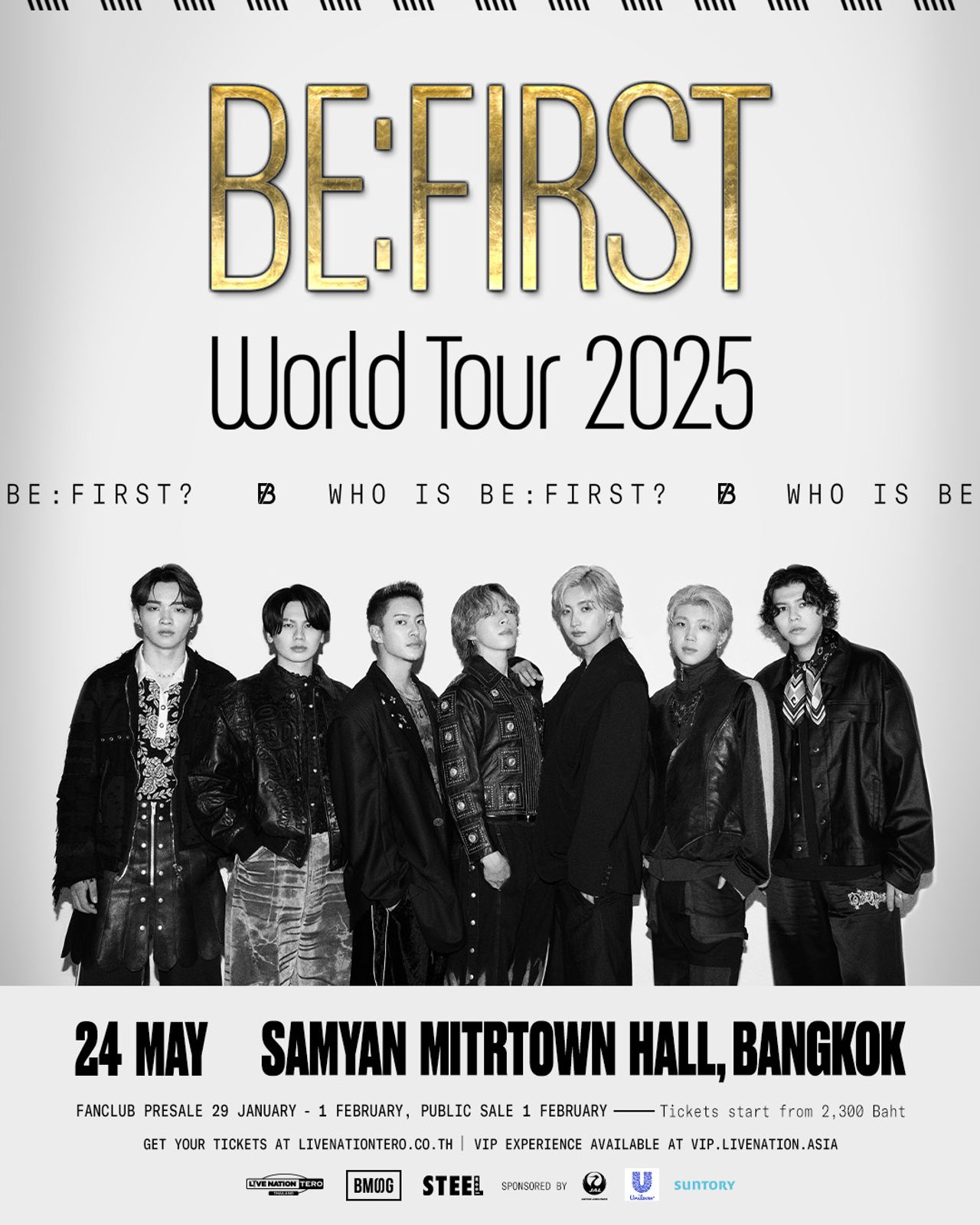 ‘BE:FIRST’ บอยกรุ๊ปสัญชาติญี่ปุ่นจากค่าย BMSG ประกอบด้วย 7 สมาชิก SOTA, SHUNTO, MANATO, RYUHEI, JUNON, RYOKI และ LEO จากรายการ ‘THE FIRST’ ซึ่งเดบิวต์อย่างเป็นทางการในปี 2564 โดย BE:FIRST โดดเด่นและเป็นที่พูดถึงในญี่ปุ่นด้วยแนวเพลงที่ผสมผสานระหว่างป๊อป ฮิปฮอป อาร์แอนด์บี และแดนซ์เพอร์ฟอร์แมนซ์ที่ทรงพลัง โดยในปี 2566 และ 2567 ที่ผ่านมา พวกเขาส่งซิงเกิ้ลฮิต ‘Boom Boom Back’ และ ‘Blissful’ จากอัลบั้ม ‘2:Be’ ทะยานขึ้นอันดับ 1 บนชาร์ต Billboard Japan Hot 100 ตอกย้ำความมาแรงด้วยซิงเกิ้ล ‘Sailing’ (เซลลิ่ง) เพลงประกอบแอนิเมชัน ‘One Piece Log: Fish-Man Island Saga’ และเตรียมเสิร์ฟซิงเกิ้ลใหม่ล่าสุด ‘Spacecraft’ (สเปซคราฟต์) ในวันที่ 5 กุมภาพันธ์นี้ ก่อนออกเดินทางครั้งใหม่ไปกับทัวร์คอนเสิร์ตในเดือนเมษายนนี้