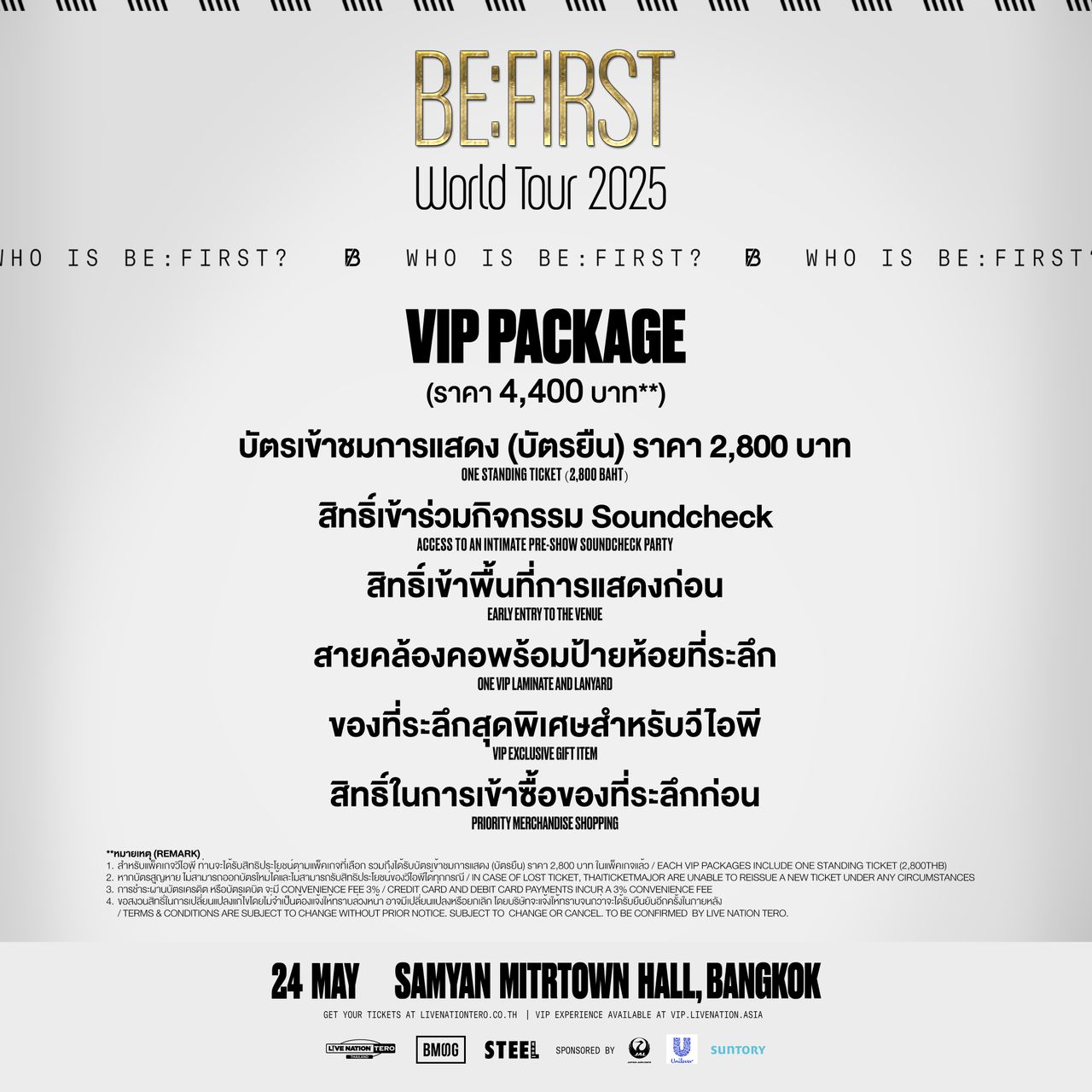 BESTY ไทย เตรียมพร้อมไปมันส์ กับคอนเสิร์ต BE:FIRST World Tour 2025 "Who is BE:FIRST?" in BANGKOK วันเสาร์ที่ 24 พฤษภาคมนี้ ที่สามย่านมิตรทาวน์ ฮอลล์ บัตรราคา 4,400 บาท (แพ็คเกจวีไอพี) 2,800 และ 2,300 บาท (บัตรยืนทั้งหมด) เปิดจำหน่ายรอบพรีเซลส์แฟนคลับวันพุธที่ 29 มกราคม เวลา 16.00 น. ถึงวันเสาร์ที่ 1 กุมภาพันธ์เวลา 9.00 น. เปิดจำหน่ายบัตรรอบทั่วไปในวันเสาร์ที่ 1 กุมภาพันธ์ เวลา 11.00 น. เป็นต้นไป ทางไทยทิกเก็ตเมเจอร์