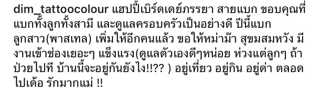 "แฮปปี้เบิร์ธเดย์ภรรยา สายแบก ขอบคุณที่แบกทั้งลูกทั้งสามี และดูแลครอบครัวเป็นอย่างดี ปีนี้แบกลูกสาว (พาสเทล) เพิ่มให้อีกคนแล้ว ขอให้หม่าม๊า สุขสมหวัง มีงานเข้าช่องเยอะๆ แข็งแรง (ดูแลตัวเองดีๆ หน่อย ห่วงแต่ลูกๆ ถ้าป่วยไปที บ้านนี้จะอยู่กันยังไง!!?? ) อยู่เที่ยว อยู่กิน อยู่ด่า ตลอดไปเด้อ รักมากแม่ !!"