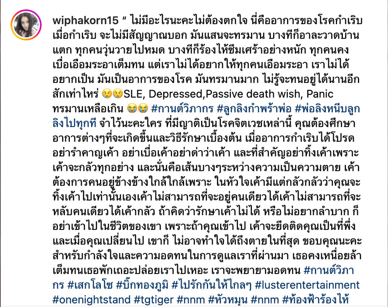 "ไม่มีอะไรนะคะ ไม่ต้องตกใจ นี่คืออาการของโรคกำเริบ เมื่อกำเริบ จะไม่มีสัญญาณบอก มันแสนจะทรมาน บางทีก็อาละวาดบ้านแตก ทุกคนวุ่นวายไปหมด บางทีก็ร้องไห้ซึมเศร้าอย่างหนัก ทุกคนคงเบื่อเอือมระอาเต็มทน แต่เราไม่ได้อยากให้ทุกคนเอือมระอา เราไม่ได้อยากเป็น มันเป็นอาการของโรค มันทรมานมาก ไม่รู้จะทนอยู่ได้นานอีกสักเท่าไหร่ SLE, Depressed, Passive death wish, Panic ทรมานเหลือเกิน #กานต์วิภากร #ลูกลิงกำพร้าพ่อ #พ่อลิงหนีบลูกลิงไปทุกที