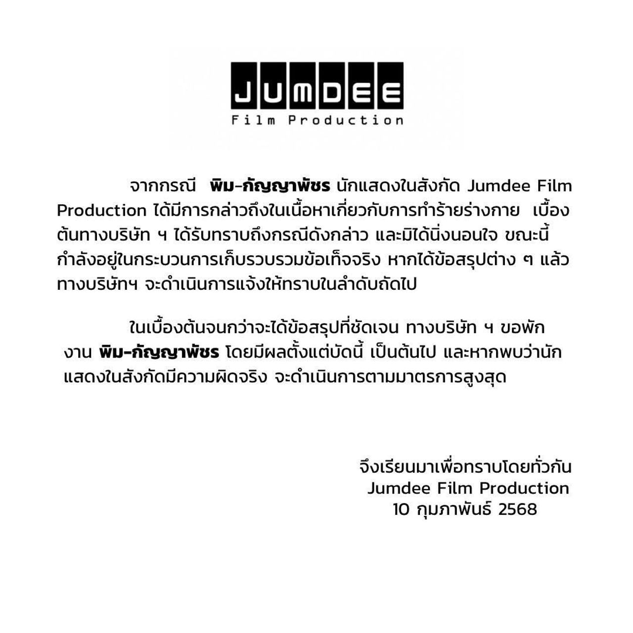 "จากกรณี พิม-กัญญาพัชร นักแสดงในสังกัด Jumdee Film Production ได้มีการกล่าวถึงในเนื้อหาเกี่ยวกับการทำร้ายร่างกาย เบื้องต้นทางบริษัทฯ ได้รับทราบถึงกรณีดังกล่าว และมิได้นิ่งนอนใจ
