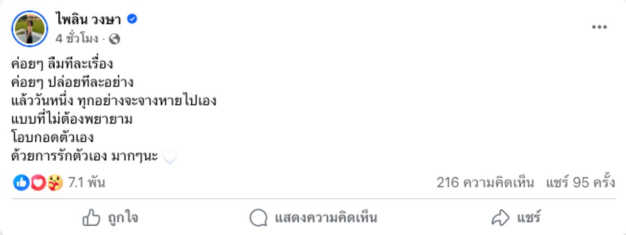 และล่าสุด แบม ไพลิน ก็ได้โพสต์ข้อความให้กำลังใจตัวเองหลังจากที่ต้องเจอกับมรสุมชีวิตที่เชื่อว่าไม่มีผู้หญิงคนไหนอยากจะเจอ โดยสาวแบมได้โพสต์ข้อความเอาไว้ว่า