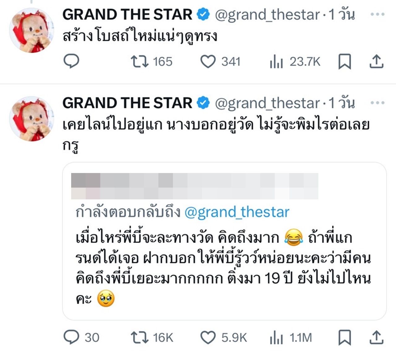 จากนั้นก็มีคนเข้ามาตอบกลับในโพสต์ของ แกรนด์ บอกว่า "เมื่อไหร่พี่บี้จะละทางวัด คิดถึงมาก ถ้าพี่แกรนด์ได้เจอ ฝากบอกให้พี่บี้รู้วว์หน่อยนะคะว่ามีคนคิดถึงพี่บี้เยอะมากกกกก ติ่งมา 19 ปี ยังไม่ไปไหนค่ะ"