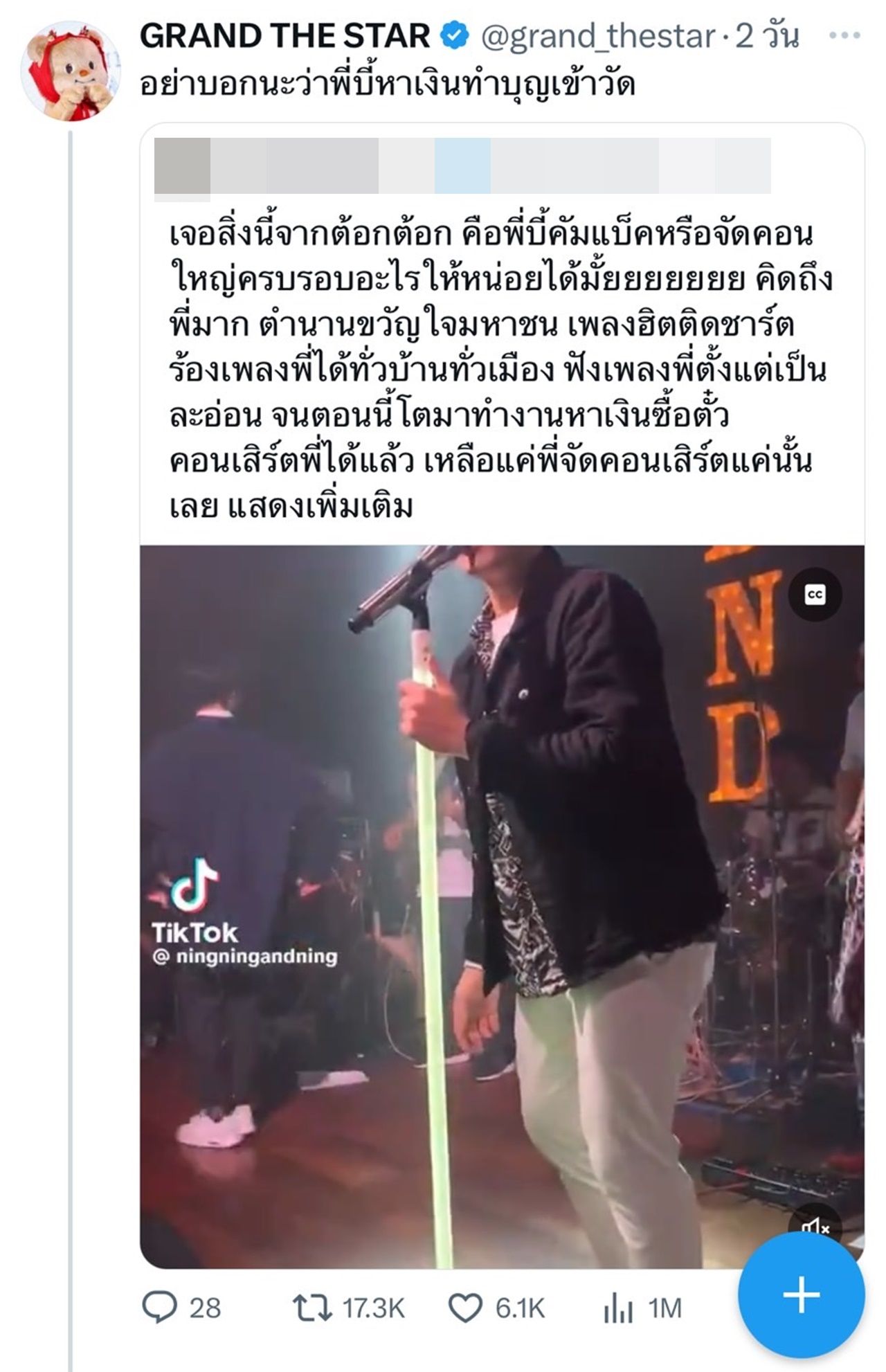 ล่าสุดได้มีคลิปของ บี้ สุกฤษฎิ์ ขึ้นเวทีร้องเพลง โพสต์ผ่าน X ด้าน แกรนด์ เดอะสตาร์ หรือ แกรนด์ กรณ์ภัสสร ก็ได้เข้ามาตอบกลับใน X บอกว่า "อย่าบอกนะว่าพี่บี้หาเงินทำบุญเข้าวัด" และ "สร้างโบสถ์ใหม่แน่ๆ ดูทรง"