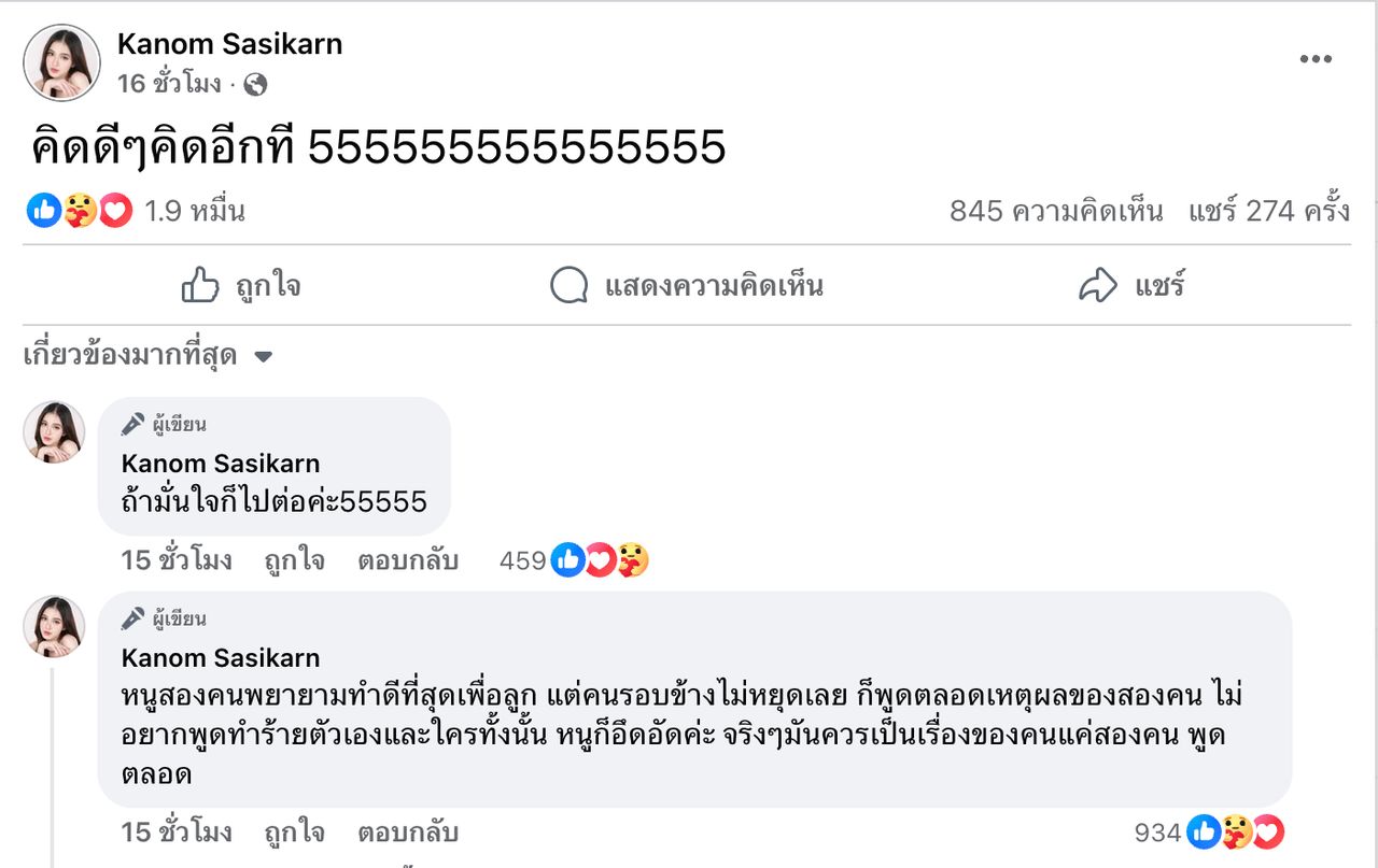 จากนั้น เจ้าตัวก็ไดโพสต์เฟซบุ๊ก Kanom Sasikarn พร้อมเขียนแคปชั่นว่า "คิดดีๆคิดอีกที 555555555555555" ก่อนจะคอมเมนต์ถึงเรื่องนี้ว่า "ถ้ามั่นใจก็ไปต่อค่ะ 55555" และนอกจากนี้เจ้าตัวก็ยังไปคอมเมนต์ตอบเอาไว้อีกว่า