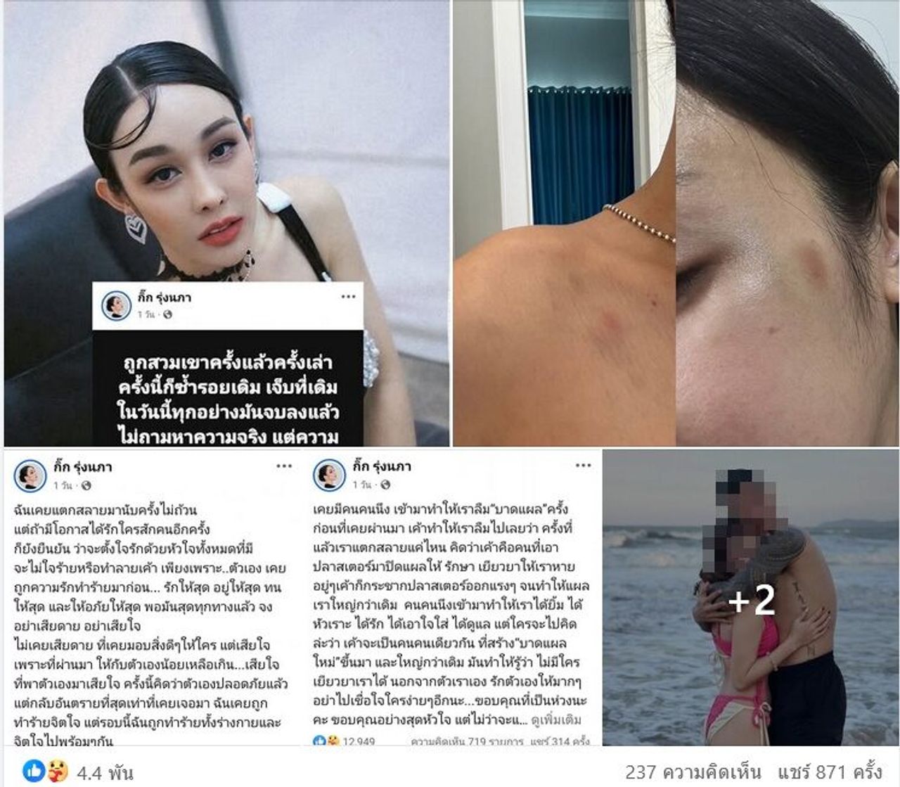 จากนั้นเจ้าตัวก็โพสต์เศร้าอีกว่าถูกทำร้ายร่างกายและจิตใจ โดยระบุว่า “ฉันเคยแตกสลายมานับครั้งไม่ถ้วน แต่ถ้ามีโอกาสได้รักใครสักคนอีกครั้ง ก็ยังยืนยัน ว่าจะตั้งใจรักด้วยหัวใจทั้งหมดที่มี จะไม่ใจร้ายหรือทำลายเค้า เพียงเพราะ..ตัวเอง เคยถูกความรักทำร้ายมาก่อน… รักให้สุด อยู่ให้สุด ทนให้สุด และให้อภัยให้สุด พอมันสุดทุกทางแล้ว จงอย่าเสียดาย อย่าเสียใจ