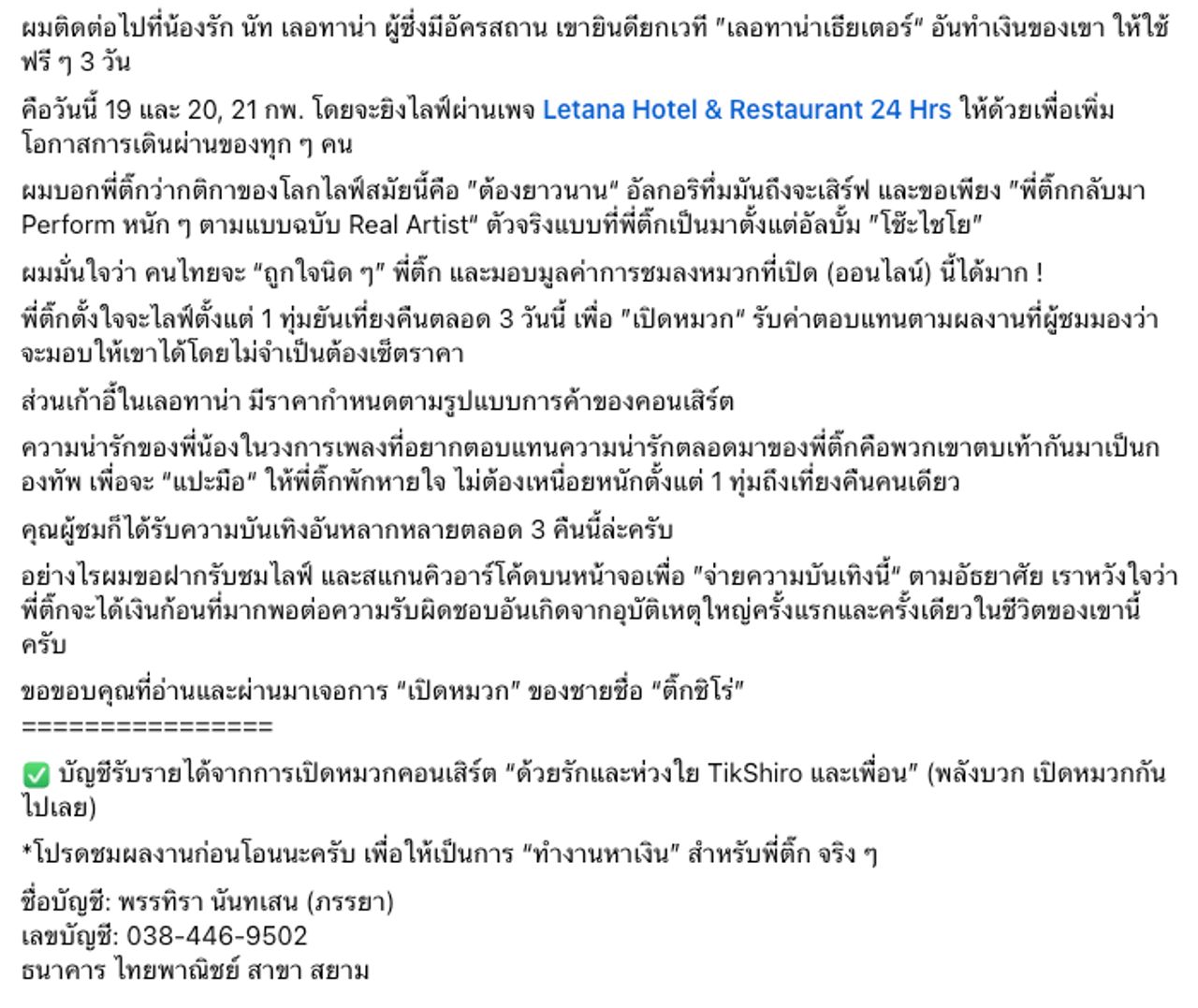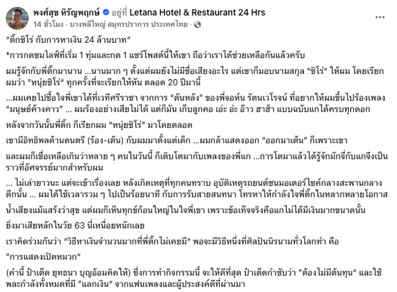 ล่าสุด หนุ่ย แบไต๋ หรือ หนุ่ย พงศ์สุข ก็ได้โพสต์แจ้งข่าวว่า ติ๊ก ชีโร่ จะไลฟ์เปิดหมวกแสดงคอนเสิร์ต 3 วัน ตั้งแต่วันที่ 19-21 ก.พ.นี้ ตั้งแต่ 1 ทุ่มจนถึงเที่ยงคืน เพื่อหาเงินมาจ่ายค่าเยียวยาให้กับครอบครัวผู้เสียชีวิต โดย หนุ่ย พงศ์สุข ได้โพสต์ข้อความลงในเพจว่า