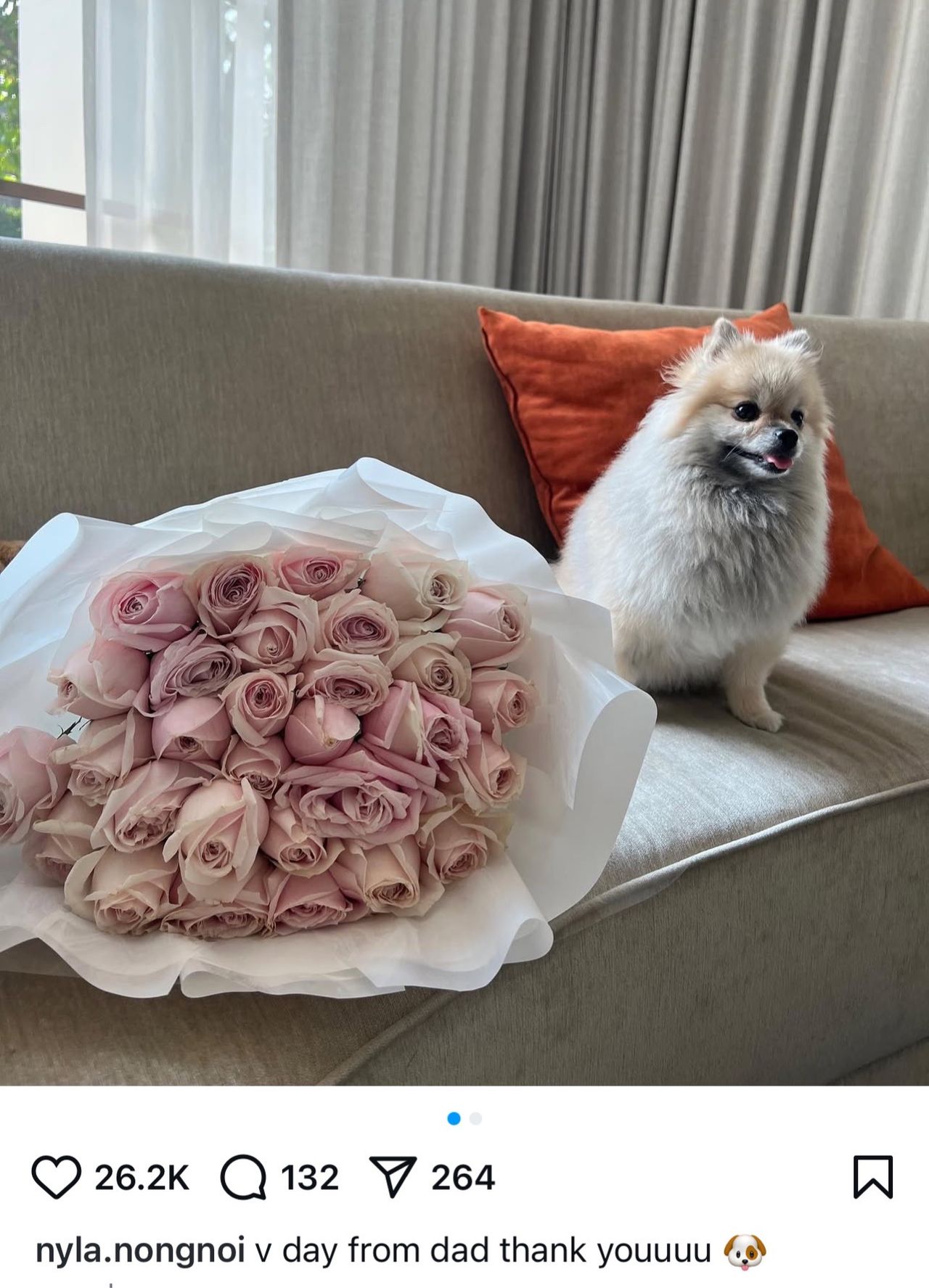 “ใช่ๆ เห็นเพื่อนๆเขามีความสุขเราก็มีความสุขแล้ว แต่นี่คือความน่ารักเลยที่ก้อยตื่นมาตอนเช้า แม่ทำการ์ดวาเลนไทน์เดินเอามาให้ คือมันก็ซึ้ง มันหลากหลายความรู้สึกมาก แล้วมีดอกไม้มาให้ด้วย เขาปรารถนาดี เขาอยากให้เรารู้สึกว่าเราไม่ได้ขาดความรักนะ ถึงแม้ว่าจะไม่ได้จากผู้ชายแต่เธอได้จากฉันนะ ก็โอเคค่ะ สรุปปีนี้ได้ดอกไม้วาเลนไทน์จากแม่และเพื่อน ก็มีจากพ่อเขา พี่นิกกี้ (ณฉัตร จันทพันธ์) ให้ดอกไม้ลูกเขามา เขาส่งมาให้คน เพราะลูกก็รับไม่ได้ไง ก็ต้องเป็นแม่ที่ไปรับแทน ก็เป็นตำนานส่งดอกไม้ให้ลูกสาว(ไนล่าน้องหมา)“