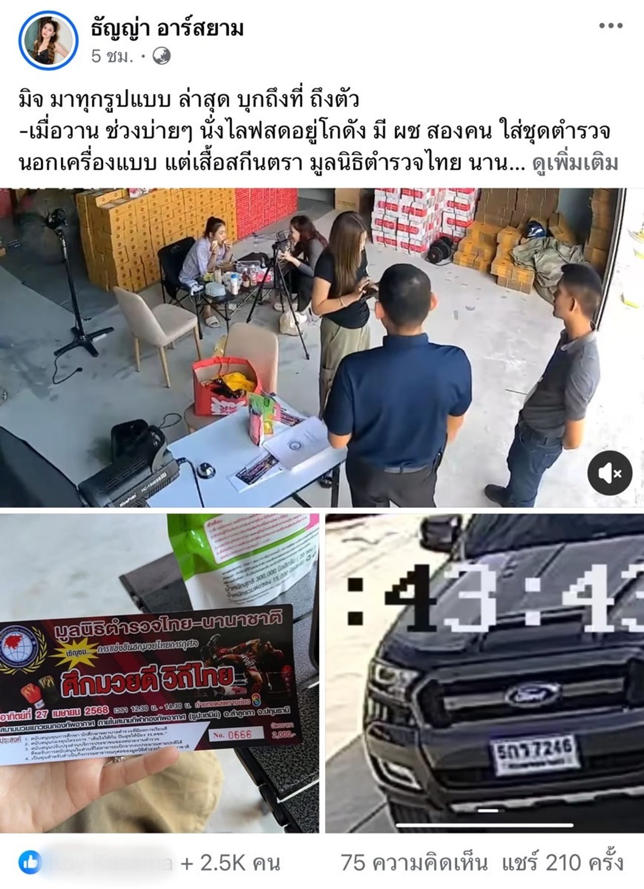 - เมื่อวาน ช่วงบ่ายๆ นั่งไลฟ์สดอยู่โกดัง มี ผช สองคน ใส่ชุดตำรวจนอกเครื่องแบบ แต่เสื้อสกรีนตรามูลนิธิตำรวจไทย นานาชาติ