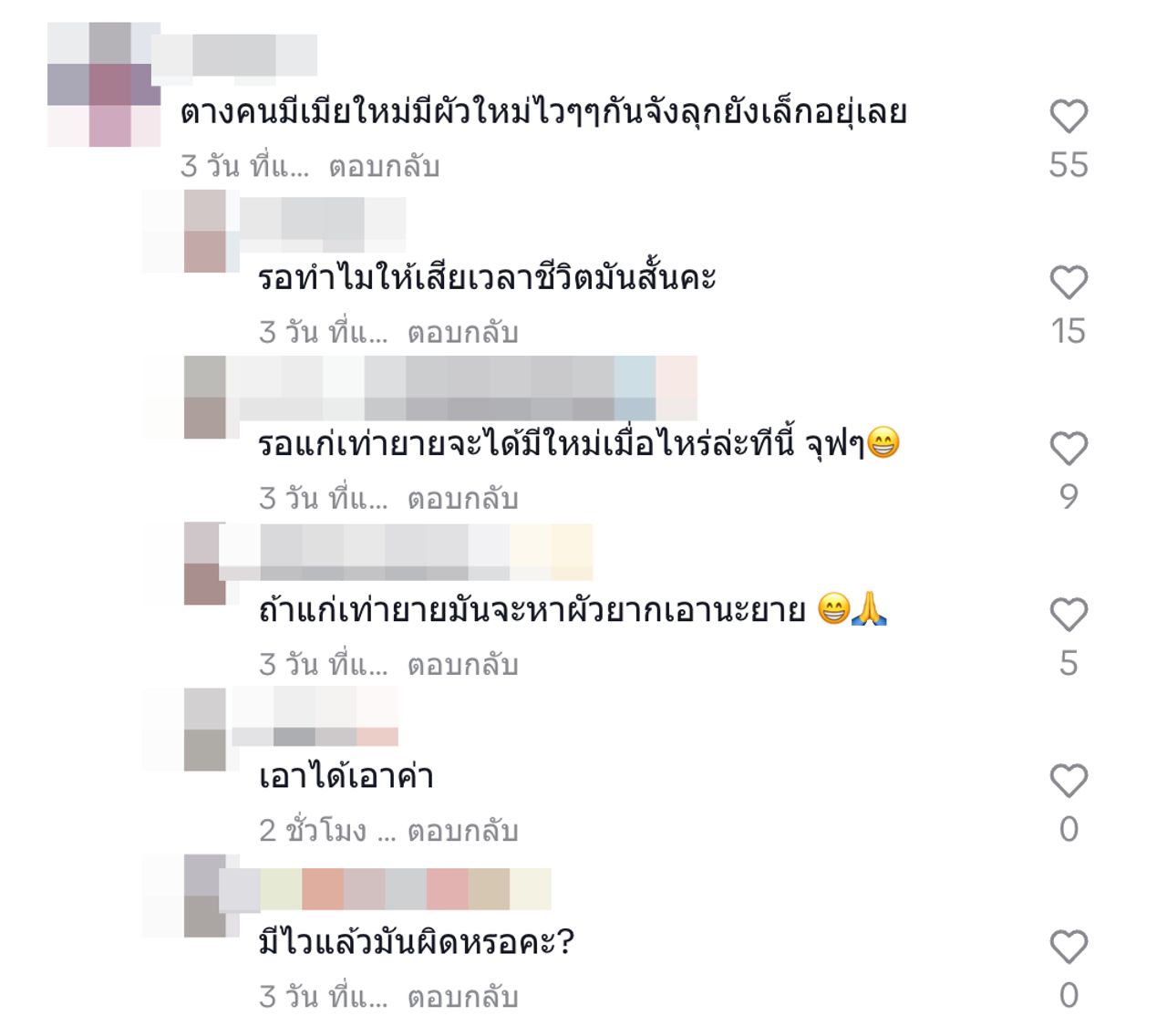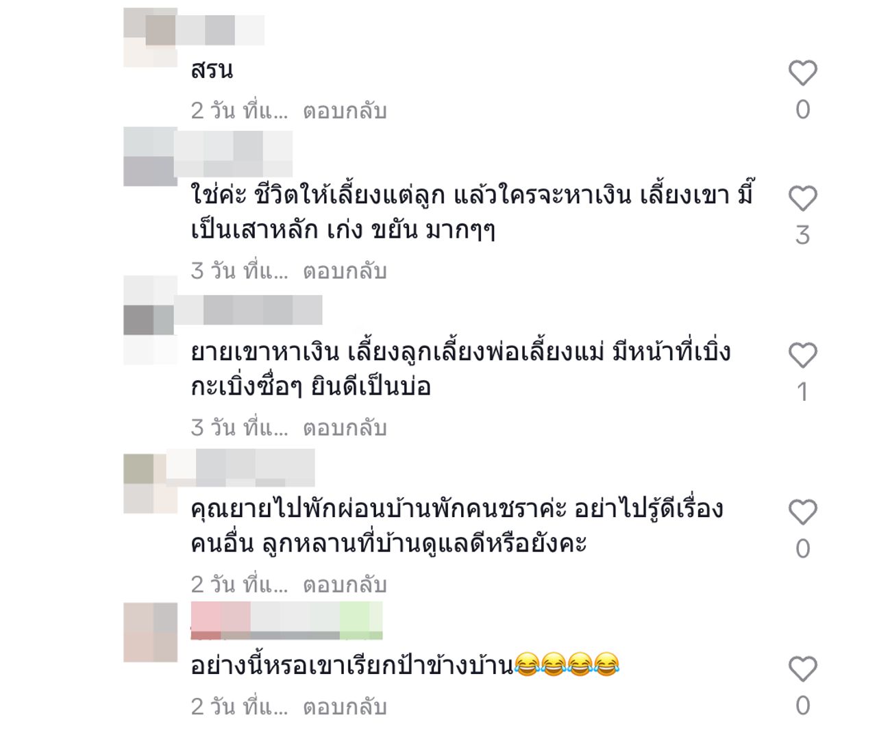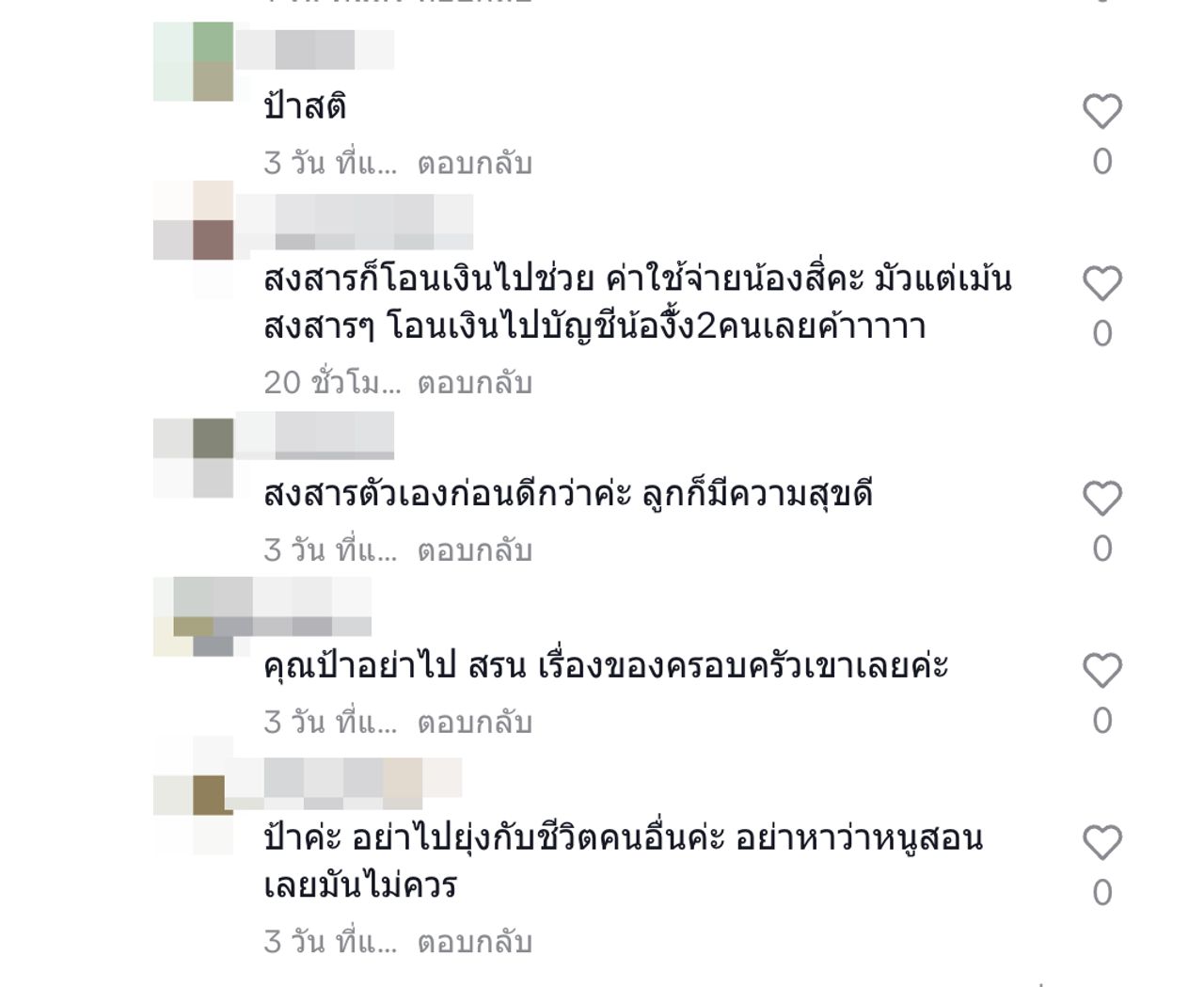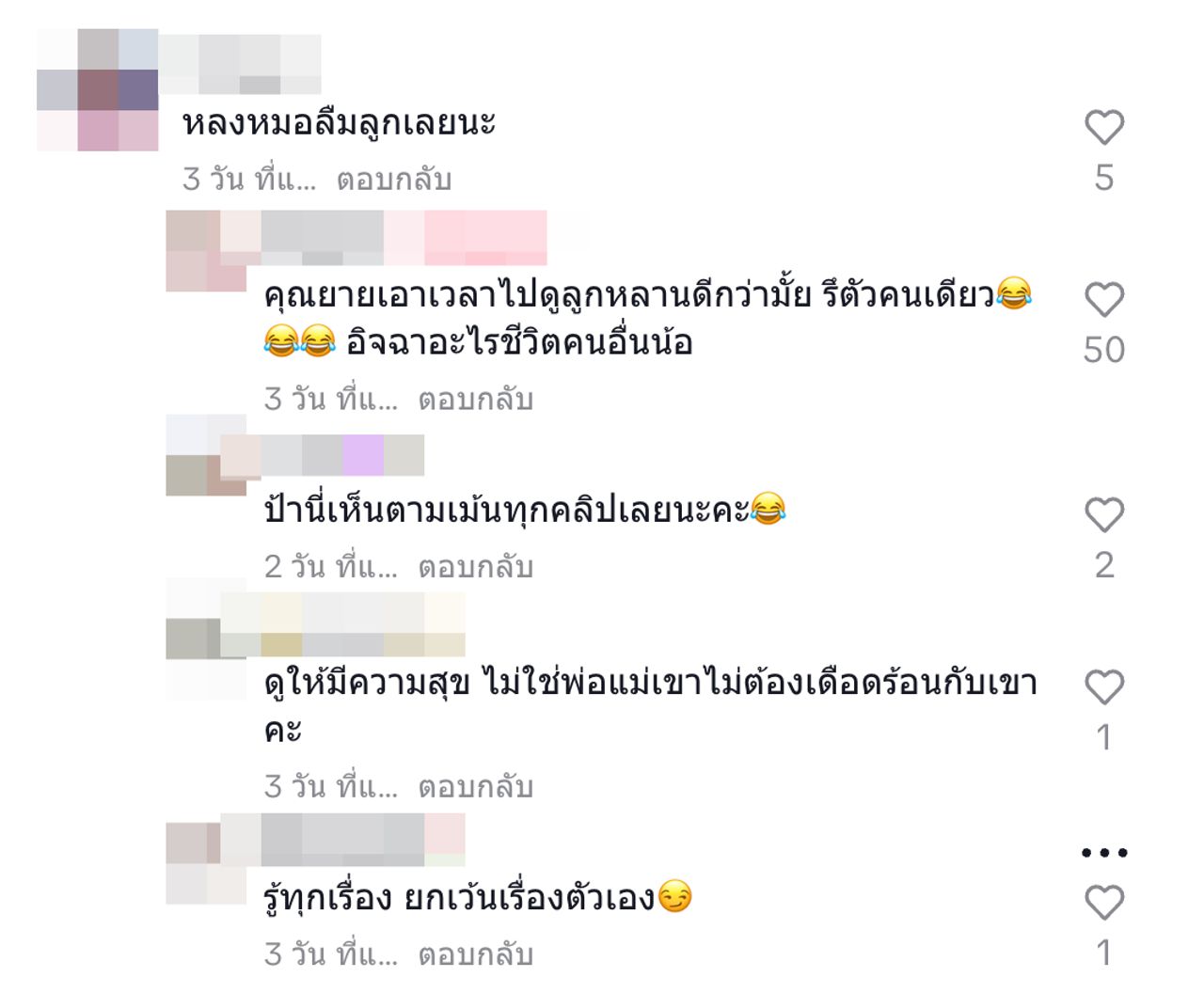 เจอแบบนี้ ชาวเน็ตก็เลยไปคอมเมนต์เตือนสติเอาไว้ว่า "คุณยายเอาเวลาไปดูลูกหลานดีกว่ามั้ย รึตัวคนเดียว อิจฉาอะไรชีวิตคนอื่นน้อ, ป้านี่เห็นตามเม้นทุกคลิปเลยนะคะ, ใช่ค่ะ ชีวิตให้เลี้ยงแต่ลูก แล้วใครจะหาเงิน เลี้ยงเขา มี๊เป็นเสาหลัก เก่ง ขยัน มากๆๆ, เขาทำงานเอาเงินไปเลี้ยงลูกไงคะป้าาาา, รอทำไมให้เสียเวลาชีวิตมันสั้นคะ, รอแก่เท่ายายจะได้มีใหม่เมื่อไหร่ล่ะทีนี้ จุ๊บๆ, มีไวแล้วมันผิดหรอคะ?"