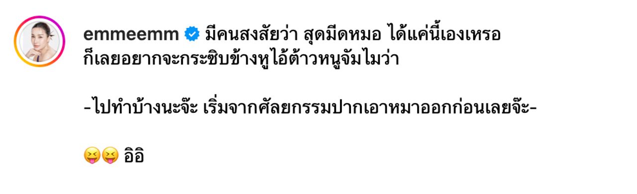 และล่าสุด ไม่รู้ว่าใครไปท้าทายระบบ เจ้าตัวถึงได้ลุกขึ้นมาโพสต์รูปโชว์สวยๆ ของตัวเอง พร้อมเขียนแคปชั่นว่า "มีคนสงสัยว่า สุดมีดหมอ ได้แค่นี้เองเหรอ ก็เลยอยากจะกระซิบข้างหูไอ้ต้าวหนูจัมไมว่า -ไปทำบ้างนะจ๊ะ เริ่มจากศัลยกรรมปากเอาหมาออกก่อนเลยจ๊ะ-อิอิ"