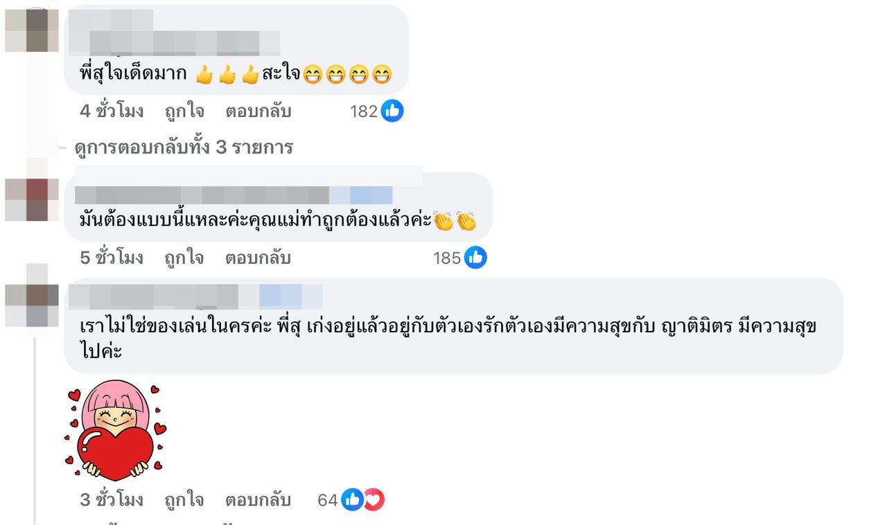 ซึ่งก็มีคนมาคอมเมนต์มากมายว่า "พี่สุใจเด็ดมาก สะใจ, มันต้องแบบนี้แหละค่ะคุณแม่ทำถูกต้องแล้วค่ะ, เราไม่ใช่ของเล่นในครค่ะ พี่สุ เก่งอยู่แล้วอยู่กับตัวเองรักตัวเองมีความสุขกับ ญาติมิตร มีความสุขไปค่ะ, จะเก็บไว้ให้รกทำไมล่ะ, สุดยอดมากแม่"