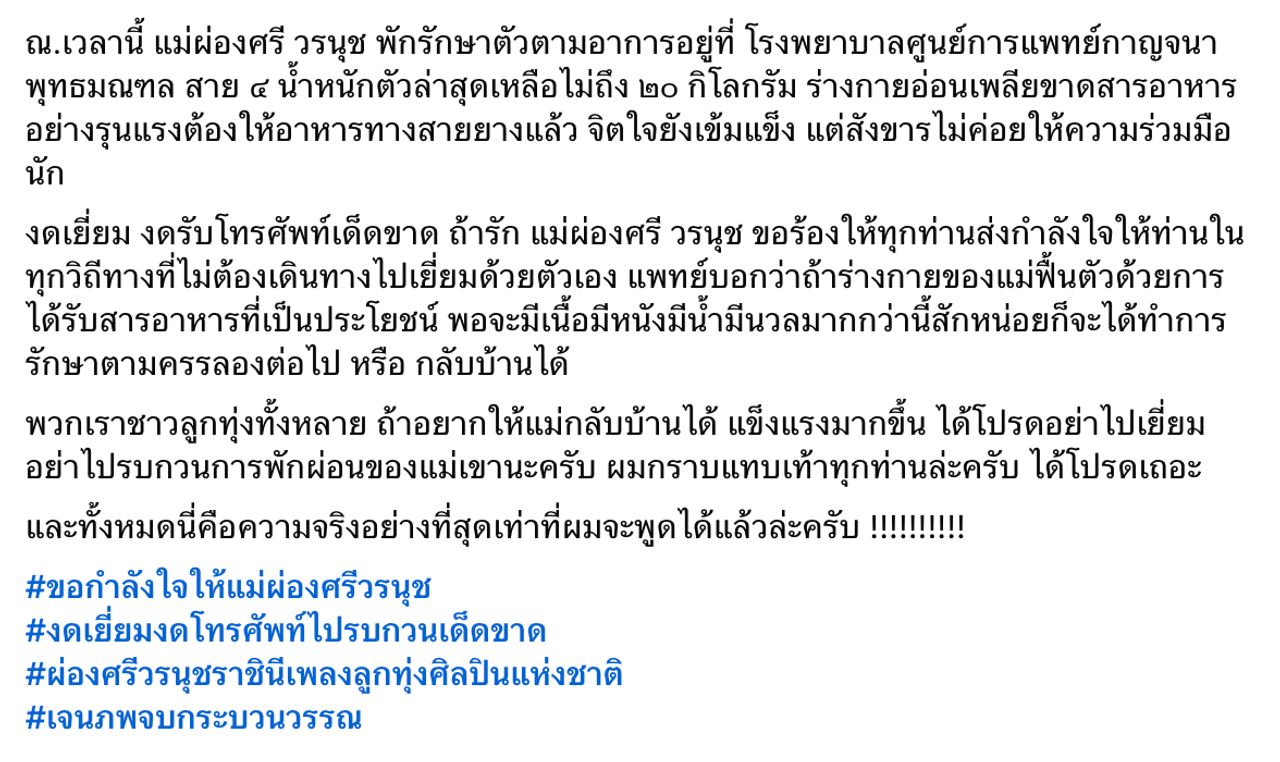 งดเยี่ยม งดรับโทรศัพท์เด็ดขาด ถ้ารัก แม่ผ่องศรี วรนุช ขอร้องให้ทุกท่านส่งกำลังใจให้ท่านในทุกวิถีทางที่ไม่ต้องเดินทางไปเยี่ยมด้วยตัวเอง