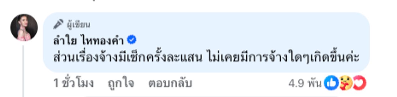 นอกจากนี้ ลำไย ยังแจงเรื่องจ้างมีเซ็กซ์เอาไว้ว่า "ส่วนเรื่องจ้างมีเซ็กซ์ครั้งละแสน ไม่เคยมีการจ้างใดๆ เกิดขึ้นค่ะ"