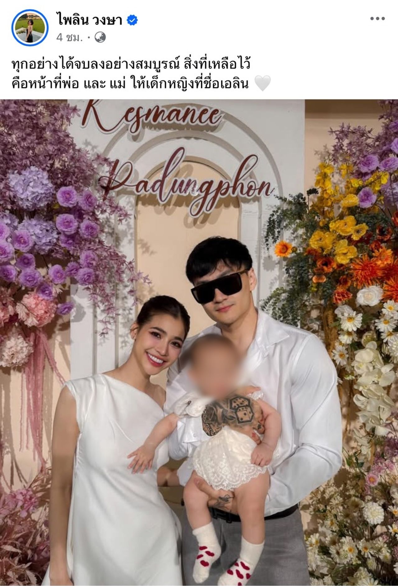 หลังจากนั้น แบม ไพลิน โพสต์ข้อความเพิ่มเติมในเฟซบุ๊กว่า “แบมต้องขอโทษ หากใครหลายๆ คนไม่เข้าใจ หลังบ้านเราเคลียร์กันและจบทุกๆ อย่างด้วยดี เพราะรอมาตลอดระยะเวลาเกือบ 1 เดือน แบมขอเดินหน้าเลี้ยงลูก และโฟกัสแค่สิ่งดีๆ ระหว่างทาง ขอบคุณกำลังใจจากทุกๆ คนนะคะ”