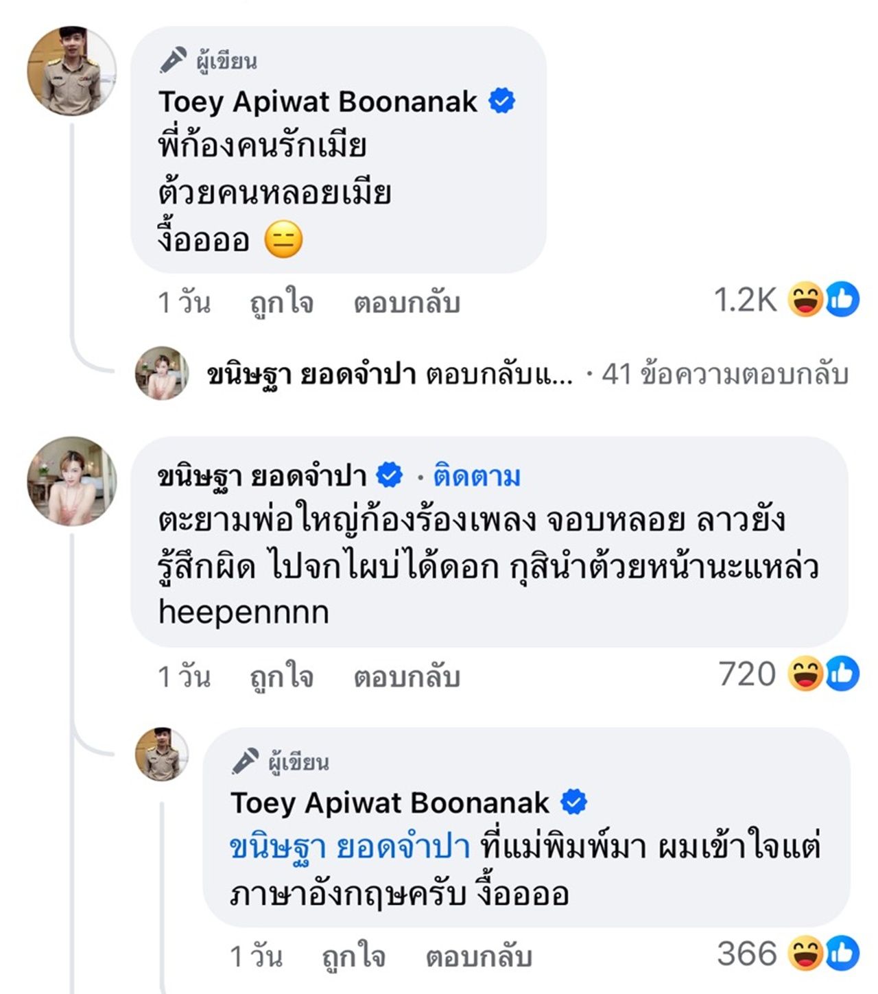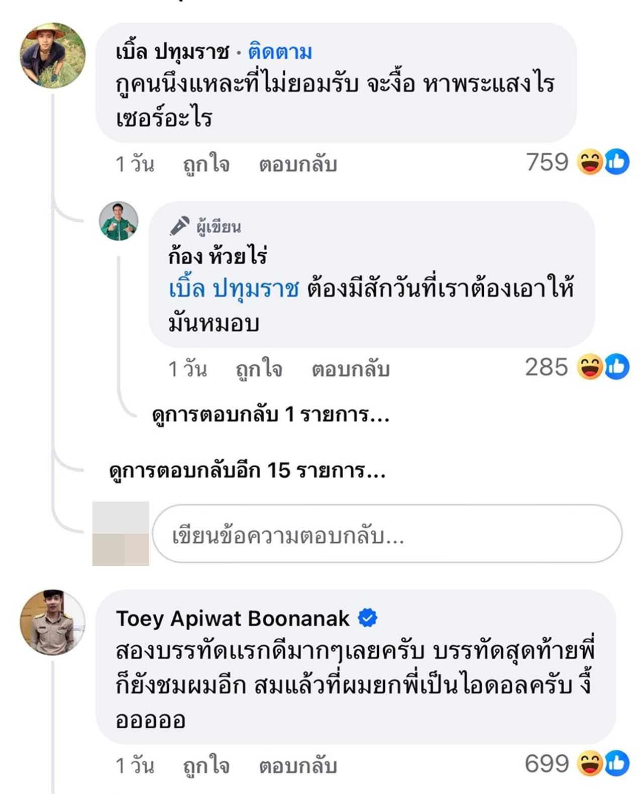 จากนั้น ก้อง ก็ได้โพสต์เพิ่มอีกว่า "วิธีเถียงกับแฟนเพลงที่ดีที่สุดคือทำผลงานออกมาให้ดี ผิดถูกรับสภาพสังคมกันเอง ส่วนเรื่องพี่น้องคงได้แต่โอบอุ้ม งื้ออออออ งื้ออออออยอดหน้ามึงสิ" และครูเต้ยก็ได้เข้ามาตอบก้องอีกว่า "สองบรรทัดแรกดีมากๆเลยครับ บรรทัดสุดท้ายพี่ก็ยังชมผมอีก สมแล้วที่ผมยกพี่เป็นไอดอลครับ งื้อออออ"