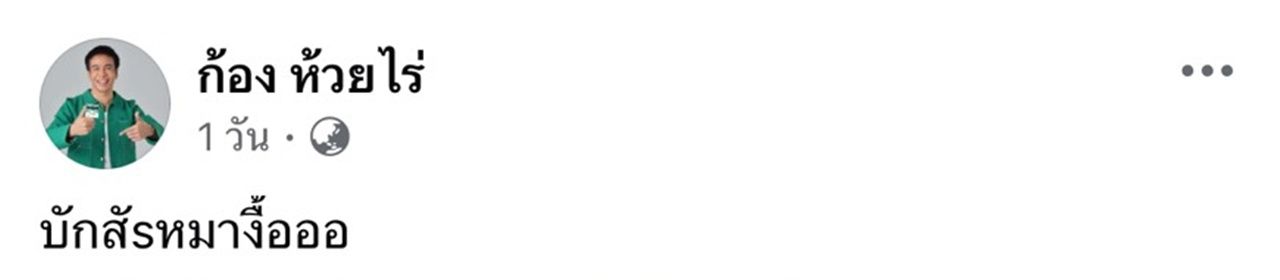 "ผมรักและศรัทธาผู้ชายคนนี้มาก อ้ายคือไอดอลผม อ้ายเก่งทุกอย่างครับ ยกเว้นเรื่องจก ต้วยชนะ เย้เย้ โพสต์นี้ผมไม่เล่นนะครับ ผมจริงจังจอมแก่น งื้ออออ" และเขียนคอมเมนต์ใต้โพสต์ตัวเองว่า "พี่ก้องคนรักเมีย ต้วยคนหลอยเมีย งื้ออออ"