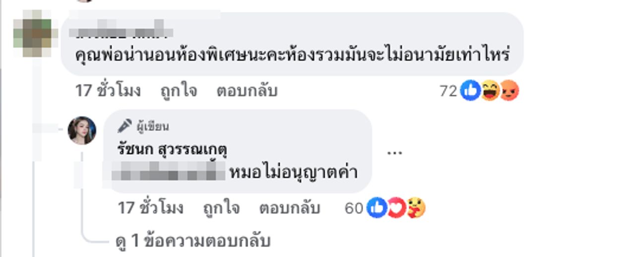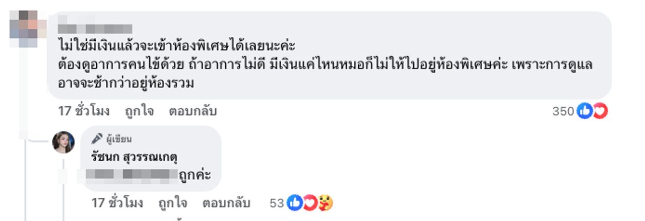 ซึ่งก็มีหลายคนมาส่งกำลังใจและอวยพรให้คุณพ่อของเจนนี่หายป่วยในเร็ววัน แต่ก็มีชาวเน็ตบางคนเข้ามาคอมเมนต์ในทำนองที่ว่า เจนนี่น่าจะให้พ่อนอนที่ห้องพิเศษน่าจะดีกว่าห้องรวมว่า "คุณพ่อน่านอนห้องพิเศษนะคะห้องรวมมันจะไม่อนามัยเท่าไหร่" แต่ก็มีคนมาคอมเมนต์ตอบเรื่องนี้แทนเจนนี่ว่า "ไม่ใช่มีเงินแล้วจะเข้าห้องพิเศษได้เลยนะค่ะ ต้องดูอาการคนไข้ด้วย ถ้าอาการไม่ดี มีเงินแค่ไหนหมอก็ไม่ให้ไปอยู่ห้องพิเศษค่ะ เพราะการดูแลอาจจะช้ากว่าอยู่ห้องรวม"