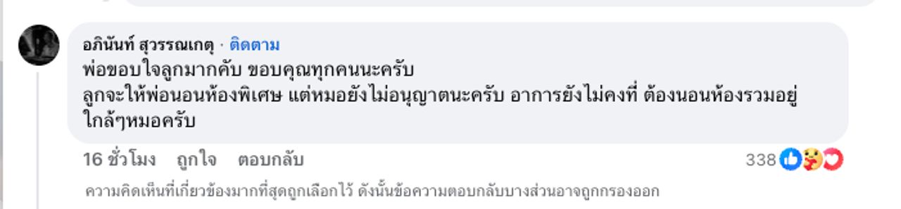 และคุณพ่อของเจนนี่ก็ได้เข้ามาคอมเมนต์ตอบกลับในเฟซบุ๊กของลูกสาวว่า "พ่อขอบใจลูกมากครับ ขอบคุณทุกคนนะครับ ลูกจะให้พ่อนอนห้องพิเศษ แต่หมอยังไม่อนุญาตนะครับ อาการยังไม่คงที่ ต้องนอนห้องรวมอยู่ใกล้ๆ หมอครับ"