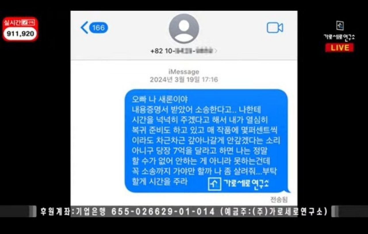"พี่คะ ฉันเองค่ะ แซรน ฉันได้รับจดหมายรับรองว่าเขากำลังจะฟ้องร้อง.. พวกเขาบอกว่าให้เวลาฉันเยอะแล้ว ฉันเลยกำลังเตรียมตัวคัมแบ็กอย่างขยันขันแข็ง และจะจ่ายคืนทีละน้อยทีละน้อยจากแต่ละโปรเจ็กต์ ฉันไม่ได้บอกว่าฉันจะไม่จ่ายคืน แต่ถ้าคุณขอเงินฉัน 700 ล้านตอนนี้ ฉันทำไม่ได้จริงๆ ไม่ใช่ว่าฉันจะไม่จ่าย ฉันแค่ทำไม่ได้ แล้วฉันต้องโดนฟ้องร้องจริงๆ เหรอ ช่วยฉันด้วย… ฉันขอร้องล่ะ ให้เวลาฉันหน่อย"