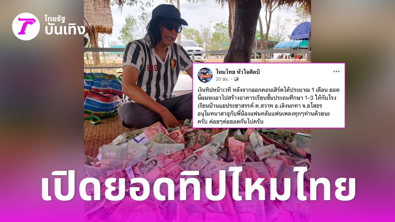 และล่าสุด ทำเอาแฟนๆ ร่วมอนุโมทนาสาธุ เมื่อไหมไทย นำเงินทิปที่ได้จากการเล่นคอนเสิร์ตประมาณ 1 เดือน มานับเพื่อนำไปสร้างอาคารเรียนที่ อ.เลิงนกทา จ.ยโสธร ซึ่งมียอดเงินทั้งสิ้น 490,196 บาท ซึ่งเจ้าตัวโพสต์รูปและแจ้งให้แฟนๆ ทราบเพื่อร่วมอนุโมทนาบุญไปด้วยกันว่า