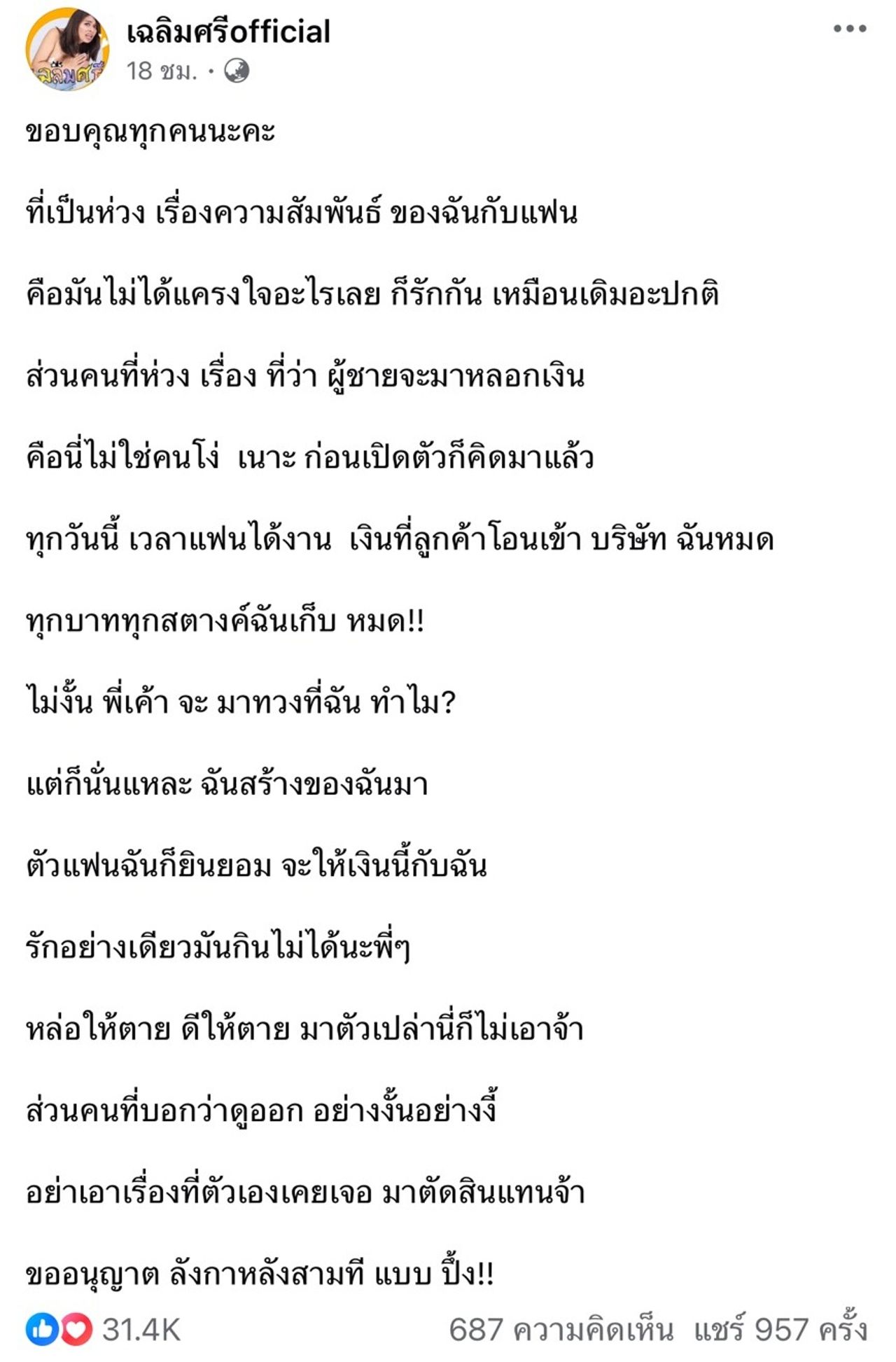“ขอบคุณทุกคนนะคะที่เป็นห่วงเรื่องความสัมพันธ์ของฉันกับแฟน คือมันไม่ได้แคลงใจอะไรเลย ก็รักกันเหมือนเดิมอะปกติ ส่วนคนที่ห่วงเรื่องที่ว่าผู้ชายจะมาหลอกเงิน คือนี่ไม่ใช่คนโง่เนาะ ก่อนเปิดตัวก็คิดมาแล้ว ทุกวันนี้เวลาแฟนได้งาน เงินที่ลูกค้าโอนเข้าบริษัทฉันหมด ทุกบาททุกสตางค์ฉันเก็บหมด!! ไม่งั้นพี่เค้าจะมาทวงที่ฉันทำไม?