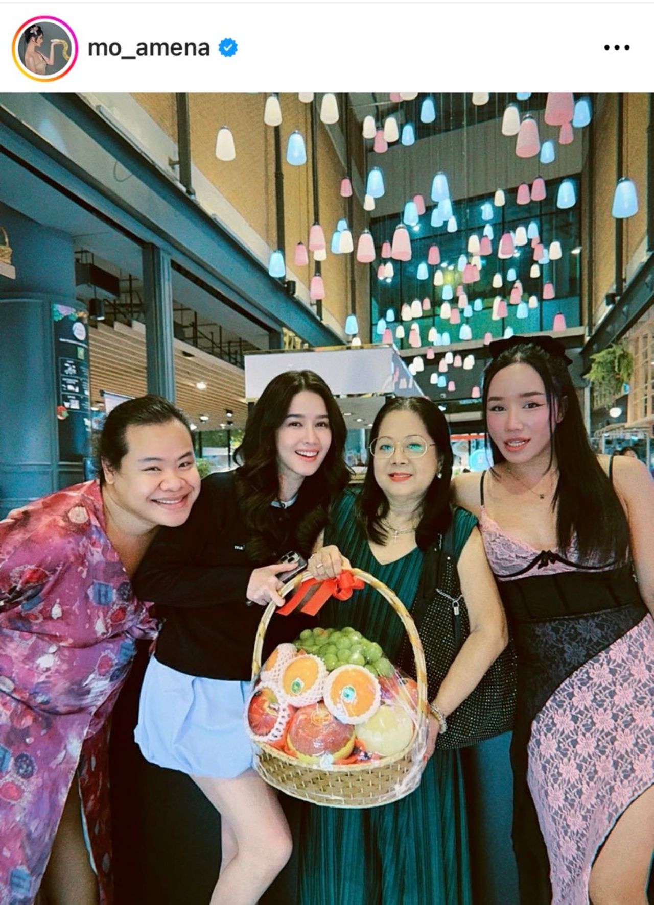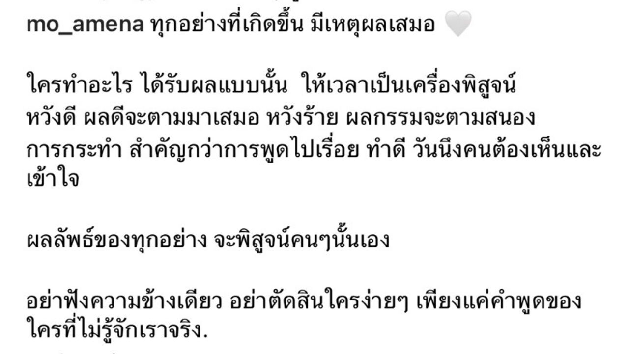 ด้าน โม อมีนา ก็ได้โพสต์ภาพดังกล่าว พร้อมเขียนแคปชั่นว่า "ทุกอย่างที่เกิดขึ้น มีเหตุผลเสมอ ใครทำอะไร ได้รับผลแบบนั้น ให้เวลาเป็นเครื่องพิสูจน์ หวังดี ผลดีจะตามมาเสมอ หวังร้าย ผลกรรมจะตามสนอง การกระทำสำคัญกว่าการพูดไปเรื่อย ทำดี วันหนึ่งคนต้องเห็นและเข้าใจ ผลลัพธ์ของทุกอย่างจะพิสูจน์คนๆ นั้นเอง อย่าฟังความข้างเดียว อย่าตัดสินใครง่ายๆ เพียงแค่คำพูดของใครที่ไม่รู้จักเราจริง"
