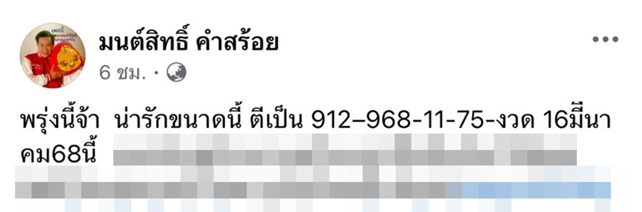 และในงวดนี้ 16 มี.ค. เลยได้มาบอกเลขที่ตัวเองชอบ เผื่อจะเป็นแนวทางให้แฟนๆ ได้เสี่ยงโชค โดย มนต์สิทธิ์ ได้โพสต์ข้อความผ่านเฟซบุ๊กตัวเอง และเขียนว่า "16 มีนาคม 68 ผมชอบเลข พ.ศ. นะงวดนี้ ชอบไหม 568–68-จัดไป" และหลายวันก่อนหน้านี้ได้โพสต์ว่า "#งวดนี้ชอบ 959-925"