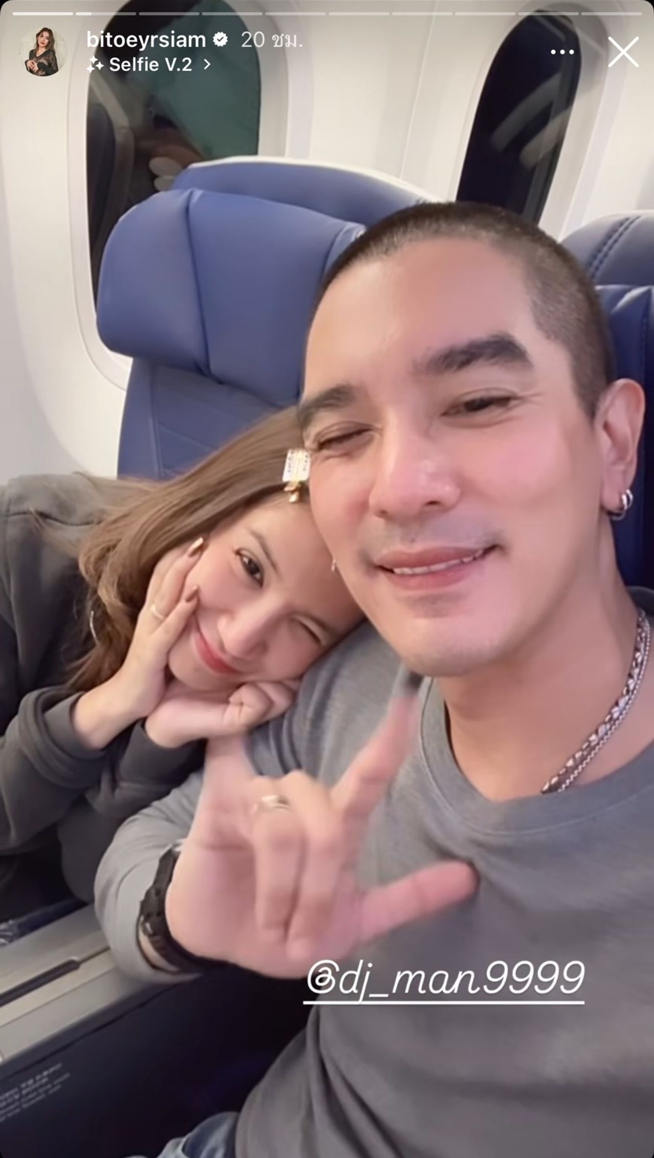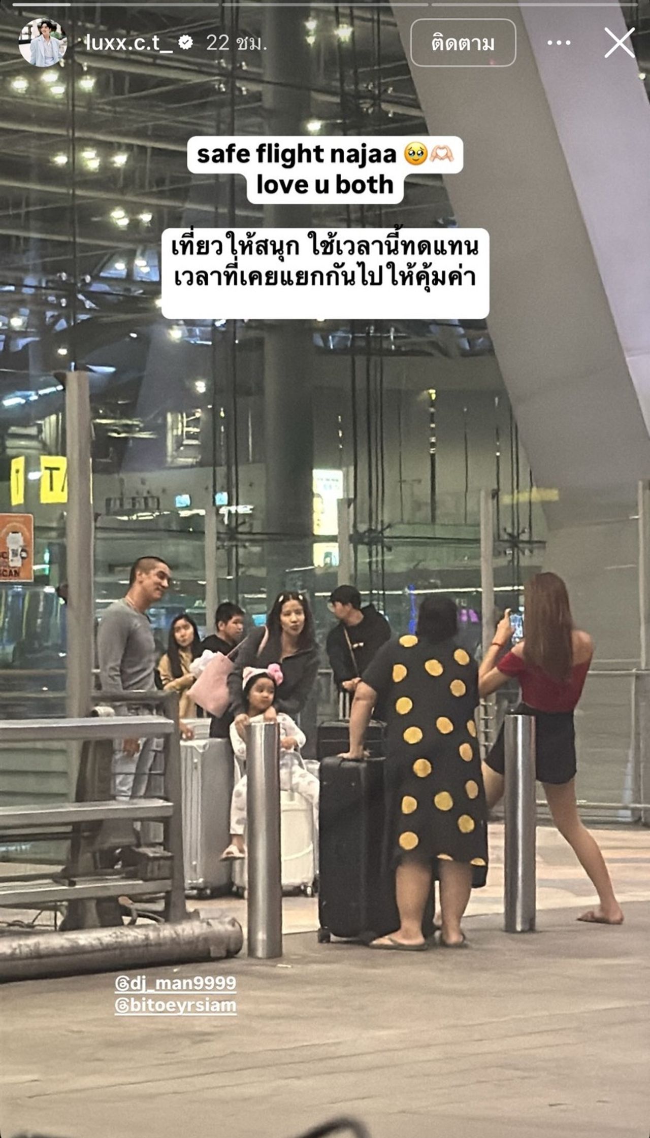 ในขณะที่ ลุกซ์ ชาญวิทย์ น้องชายของใบเตย ก็ได้โพสต์ภาพของทั้งคู่ลงไอจีสตอรี่และเขียนข้อความว่า “safe flight najaa love u both เที่ยวให้สนุก ใช้เวลานี้ทดแทนเวลาที่เคยแยกกันไป ให้คุ้มค่า”