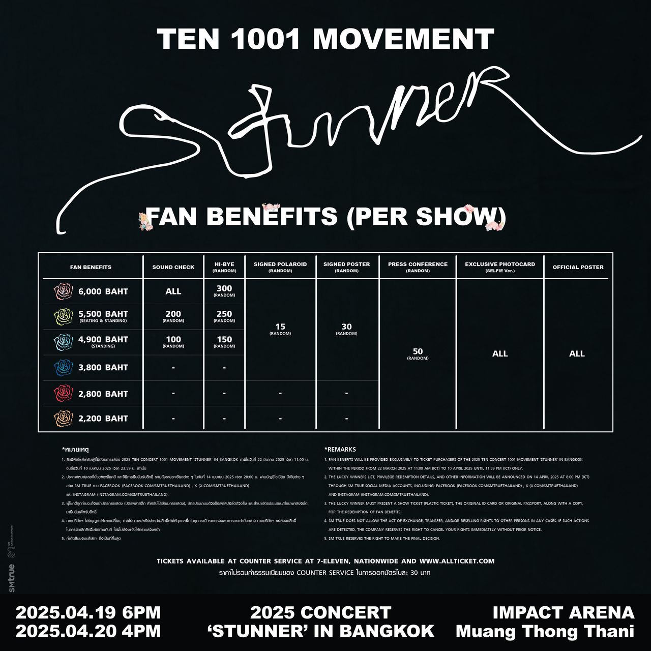 SM True (เอสเอ็ม ทรู) และ TEN (เตนล์) ร่วมกำหนดนิยามของการแสดงสู่มิติใหม่ที่ทุกคนจะต้องตกตะลึง กับคอนเสิร์ตเดี่ยวเต็มรูปแบบครั้งแรก ณ บ้านเกิด ประเทศไทย 2025 TEN CONCERT 1001 MOVEMENT 'STUNNER' IN BANGKOK (ทูเธาซันด์ทเวนตี้ไฟว์ เตนล์ คอนเสิร์ต วันซีโร่ซีโร่วัน มูฟเมนต์ ‘สตันเนอร์’ อิน แบงค็อก) วันเสาร์ที่ 19 เมษายน 2025 เวลา 18:00 น. และวันอาทิตย์ที่ 20 เมษายน 2025 เวลา 16:00 น. ณ อิมแพ็ค อารีน่า