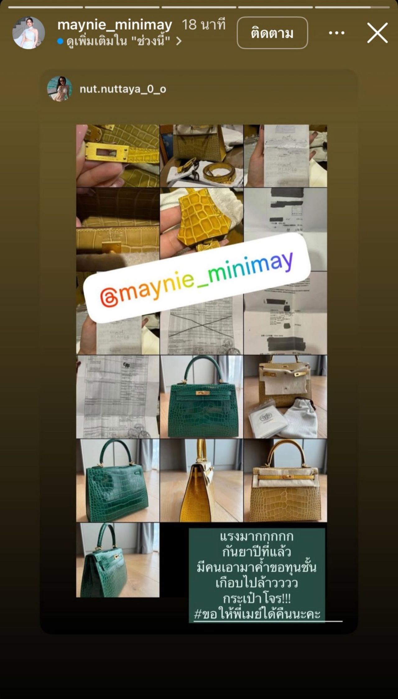 โดยมาจากกรณีรุ่นน้องคนหนึ่งชื่อ บอส แนะนำ ไม่ได้รู้จักกันมาก่อน และเจ้าตัวยืนยันไม่ได้เกี่ยวข้อง พร้อมกับให้ความร่วมมือ ซึ่งก็เป็นแชตที่มีการพูดคุยราคาทั้งกระเป๋าและนาฬิกาหรู โดย เมย์ ได้บอกว่า “ขอบคุณที่ให้ความร่วมมือนะคะ (เห็นของแล้วใจสลาย)”