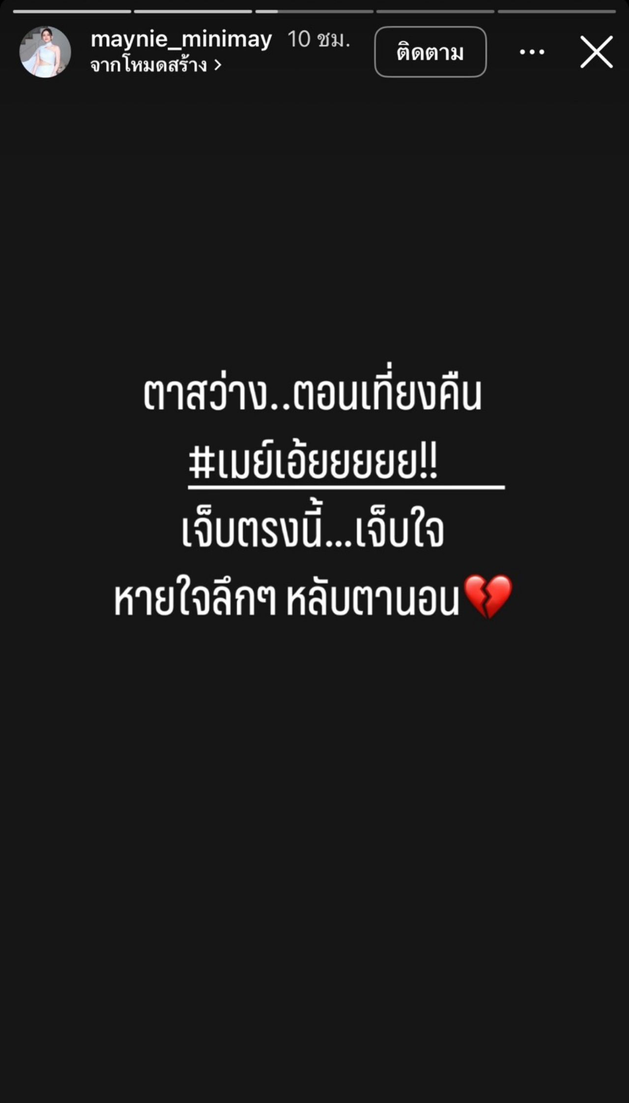 ก่อนจะโพสต์เพิ่มเติมบอกว่าเพิ่งรู้เรื่องทั้งหมดที่ทำให้ตาสว่าง “ตาสว่าง..ตอนเที่ยงคืน #เมย์เอ้ยยยยย!! เจ็บตรงนี้..เจ็บใจ หายใจลึกๆ หลับตานอน”