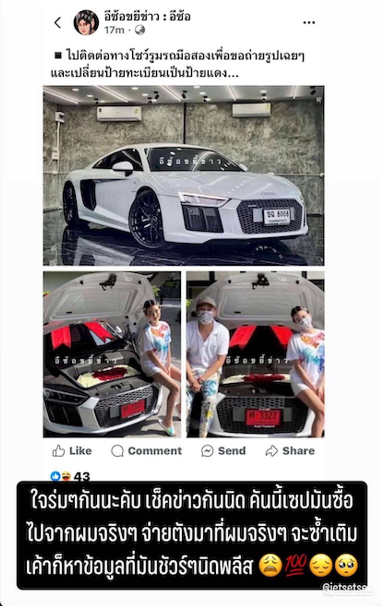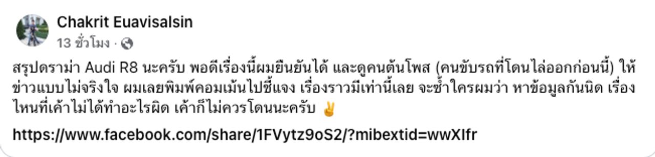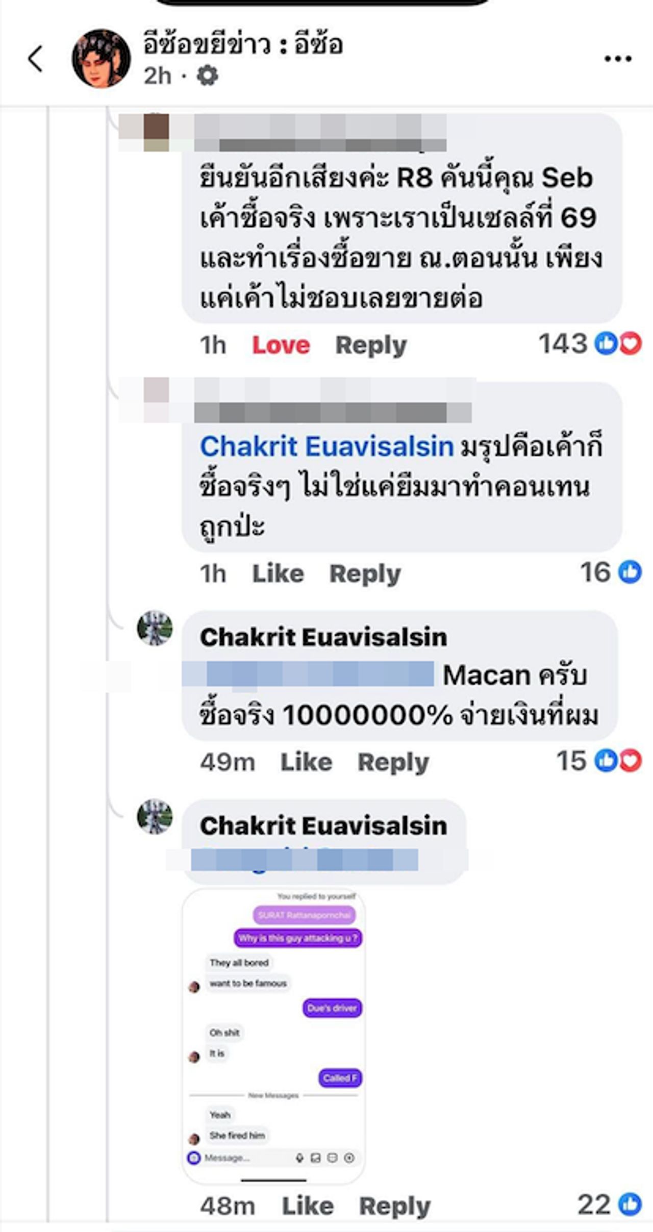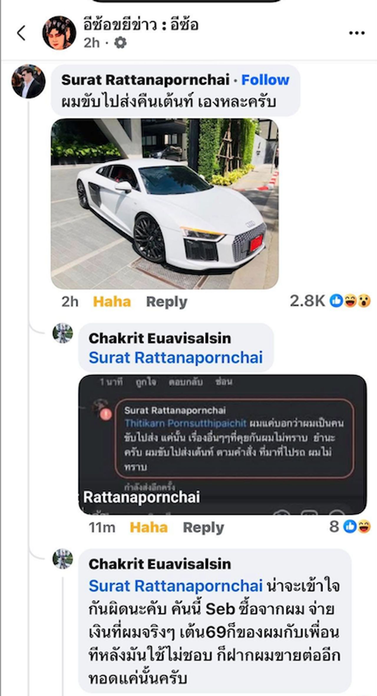 จากนั้น เจ้าของรถคนดังกล่าวยังได้แคปรูปเพจข่าวดังกล่าว และเขียนข้อความอธิบายเอาไว้ว่า "ใจร่มๆ กันนะคับ เช็คข่าวกันนิด คันนี้เซบมันซื้อไปจากผมจริงๆ จ่ายตังค์มาที่ผมจริงๆ จะซ้ำเติมเขาก็หาข้อมูลที่มันชัวร์ๆ นิดพลีส" และเขียนแคปชั่นเอาไว้อีกว่า "สรุปดราม่า Audi R8 นะครับ พอดีเรื่องนี้ผมยืนยันได้ และดูคนต้นโพสต์ (คนขับรถที่โดนไล่ออกก่อนนี้) ให้ข่าวแบบไม่จริงใจ ผมเลยพิมพ์คอมเม้นต์ไปชี้แจง เรื่องราวมีเท่านี้เลย จะซ้ำใครผมว่า หาข้อมูลกันนิด เรื่องไหนที่เค้าไม่ได้ทำอะไรผิด เค้าก็ไม่ควรโดนนะครับ"