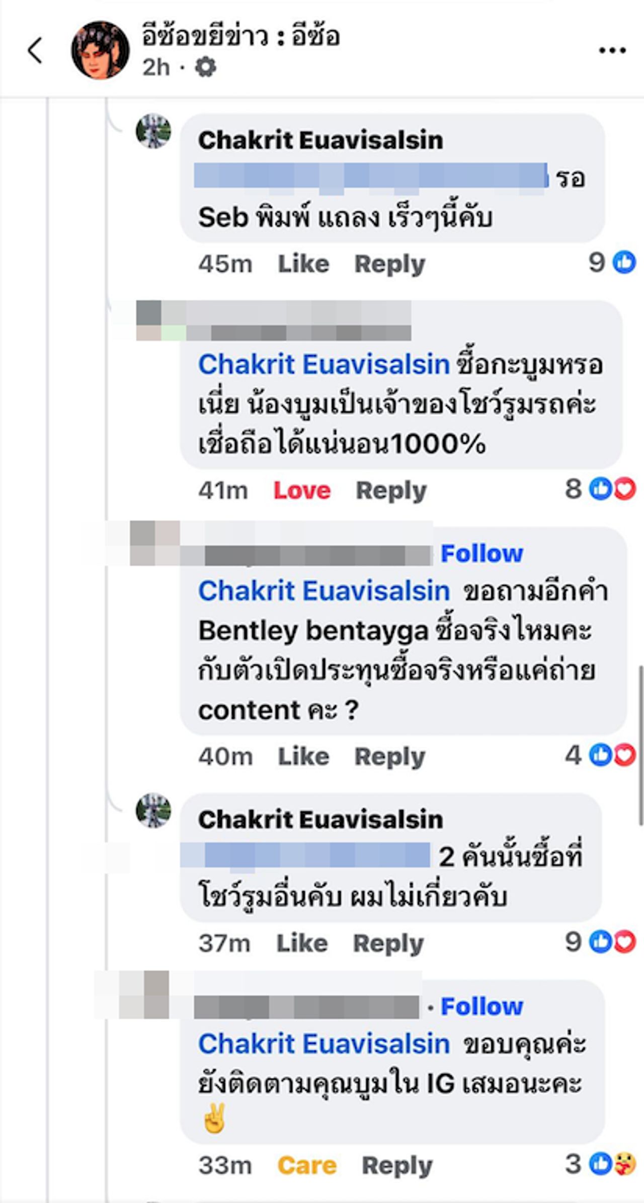 ซึ่งเจ้าของรถเดิมได้เข้าไปคอมเมนต์อธิบายเอาไว้ว่า "น่าจะเข้าใจกันผิดนะคับ คันนี้ seb ซื้อจากผม จ่ายเงินที่ผมจริงๆ เต้นท์ 69 ก็ของผมกับเพื่อน ทีหลังมันใช้ไม่ชอบ ก็ฝากผมขายต่ออีกทอดแค่นั้นครับ" และ "Macan ครับ ซื้อจริง 10000000% จ่ายเงินที่ผม" พร้อมกับ ตอบคำถามที่มีคนถามถึงรถอีก 2 คันที่มีคนถามเข้ามา เจ้าตัวบอกว่า ซื้อจากที่อื่น ตนไม่เกี่ยว