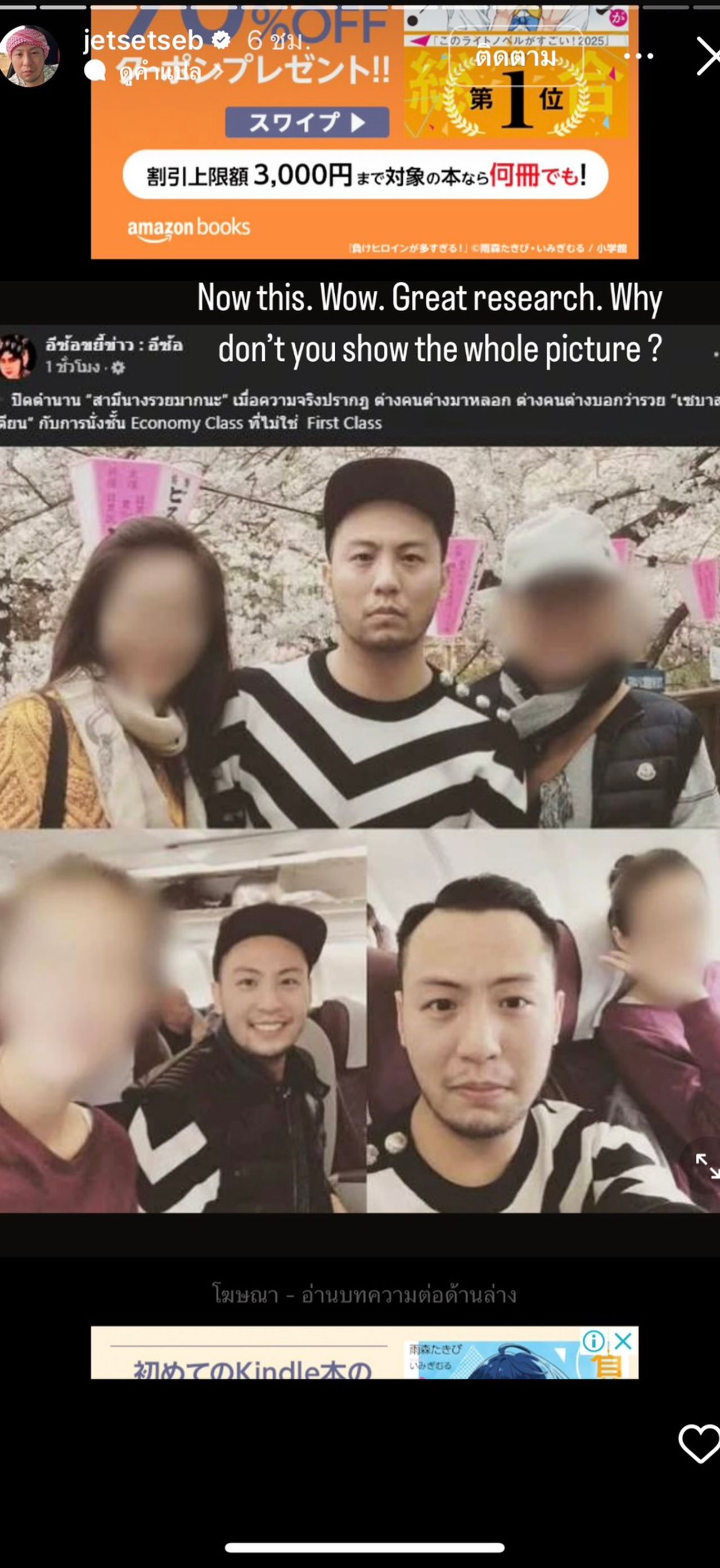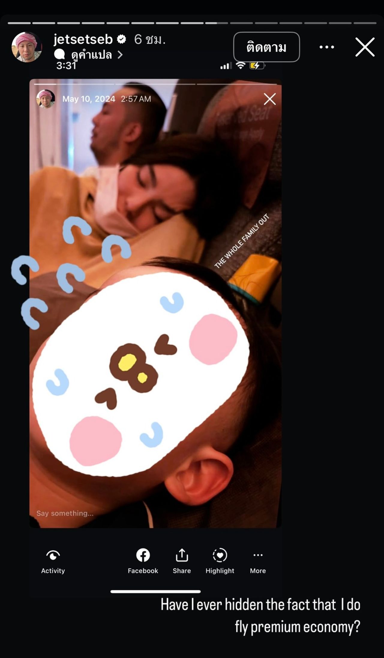 โดยเซบาสเตียนออกมาโพสต์ตอบโต้ประเด็นเรื่องนั่งเครื่องบิน โดยมีภาพกับ ดิว อริสรา และลูกที่เคยนั่งเครื่องบินด้วยกัน พร้อมข้อความว่า “Have I ever hidden the fact that I do fly premium economy?” (ผมเคยปกปิดความจริงที่ว่าผมบินพรีเมียมอีโคโนมีเหรอ?) โพสต์ต่อมาคือ “I said this in 2023 and I say this today. Value for money!” (ผมพูดเรื่องนี้ไปแล้วในปี 2023 และวันนี้ก็ยังพูดแบบเดิม คุ้มค่ากับเงิน!) ซึ่งหมายความว่า ที่เลือกนั่ง Premium Economy เพราะเหตุผลในด้านความคุ้มค่า ไม่ใช่เพราะไม่มีเงิน และโพสต์ต่อมา “Teaching everyone how to be normal in premium economy.” (กำลังสอนให้ทุกคนรู้วิธีเป็นคนธรรมดาใน Premium Economy)