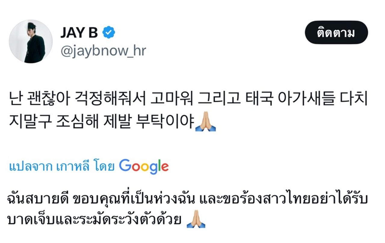 "ผมสบายดี ขอบคุณที่เป็นห่วง และขอร้องสาวไทยอย่าได้รับบาดเจ็บและระมัดระวังตัวด้วย ได้โปรด ขอร้องล่ะ"