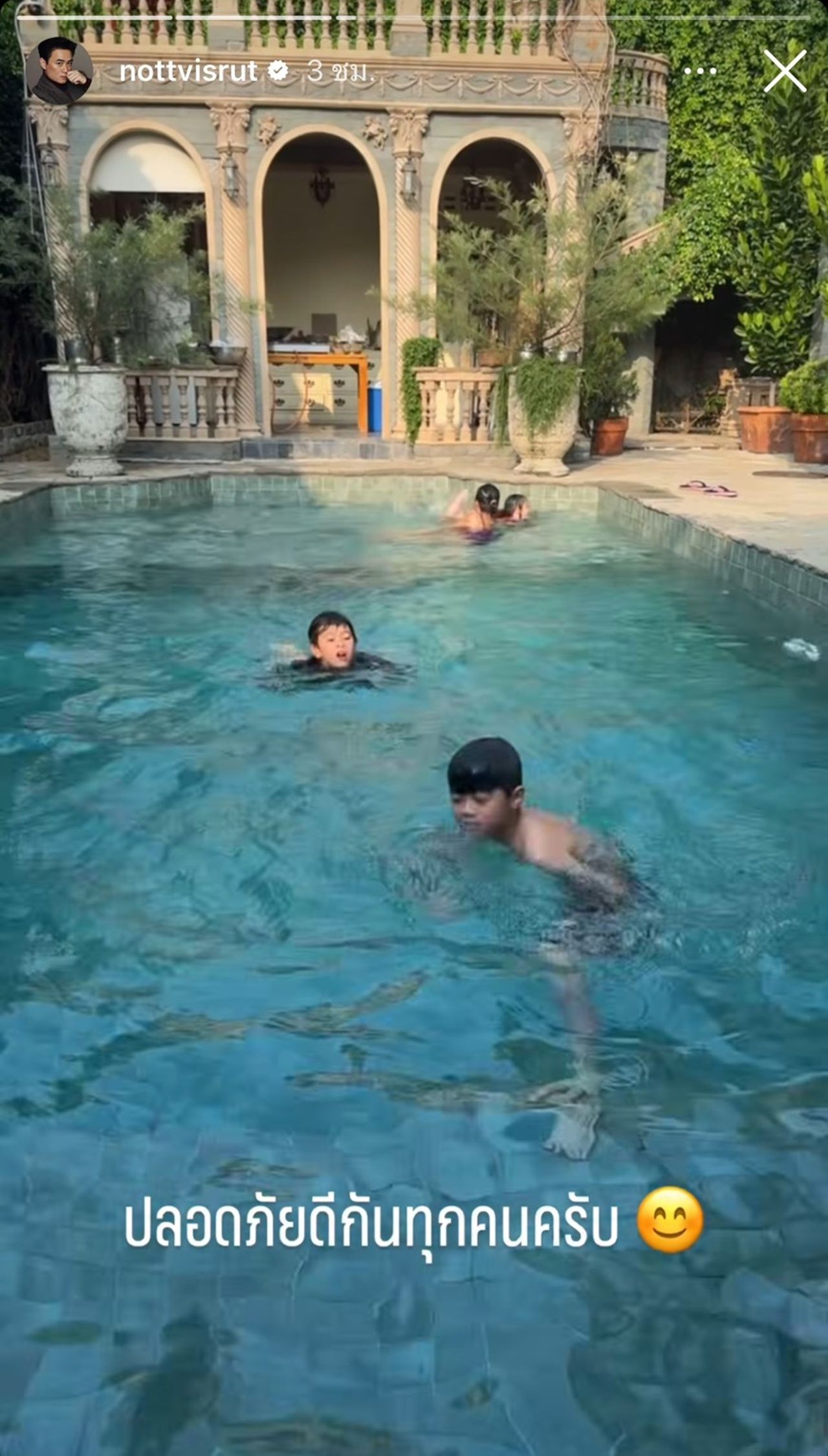 ล่าสุด พ่อน็อต วิศรุต ก็ได้โพสต์ไอจีสตอรี่เป็นคลิปที่เด็กๆ พี่สายฟ้า พี่พายุ และน้องเกล รวมไปถึงยายหนิง กำลังเล่นน้ำในสระว่ายน้ำอยู่ที่บ้านของยายหนิง พร้อมเขียนข้อความว่า "ปลอดภัยกันดีทุกคนครับ (อีโมจิยิ้ม)"